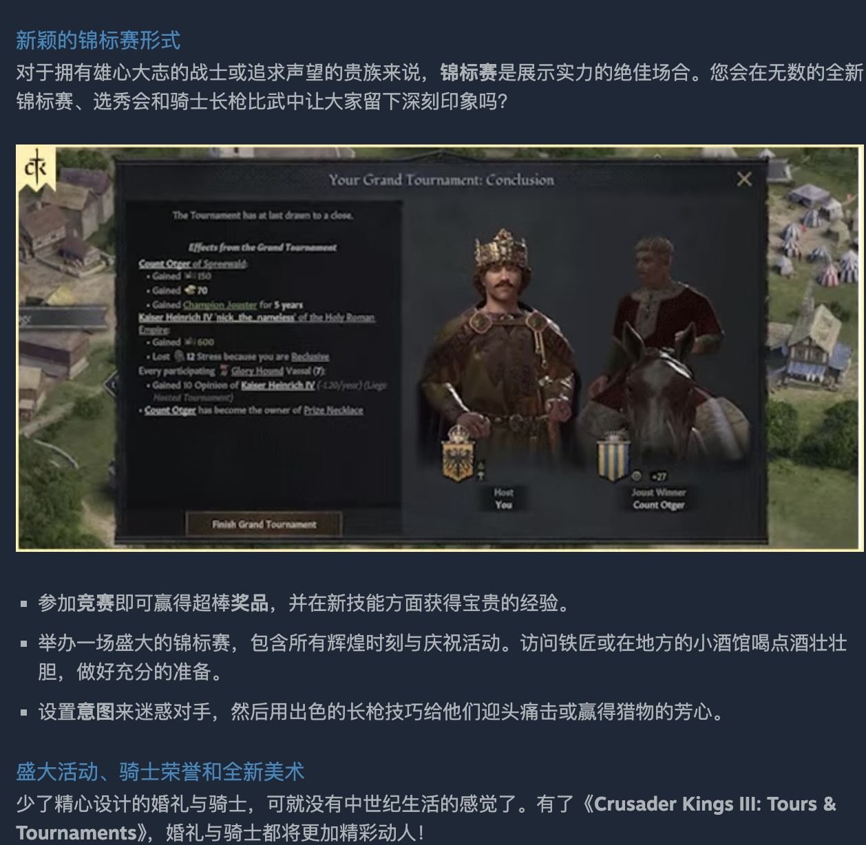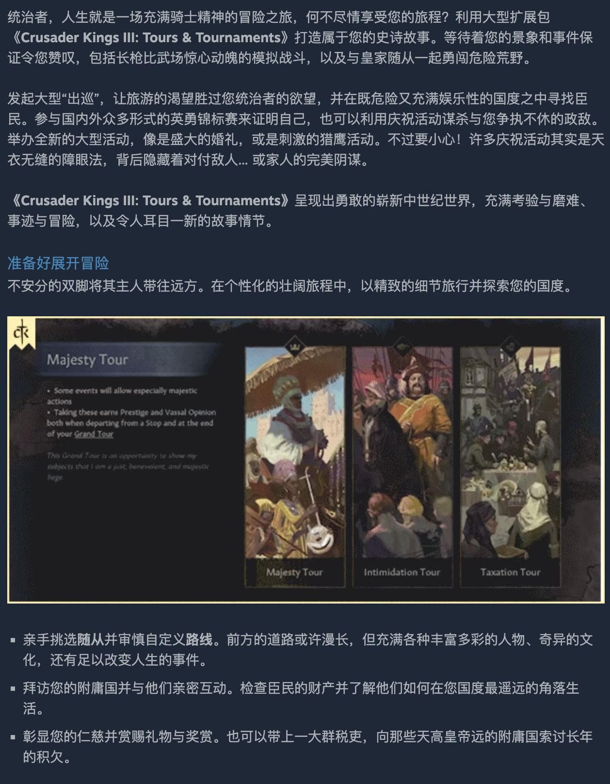 由于上一个dlc被玩家骂了个狗血淋头,所以p社痛定思痛,推出了巡游和竞赛dlc,这个dlc是p社现在第二成功的dlc,游戏中的旅游和各种活动都是以这个dlc为基础的,并且很大程度上提高了游戏的趣味度,所以是非常推荐的。