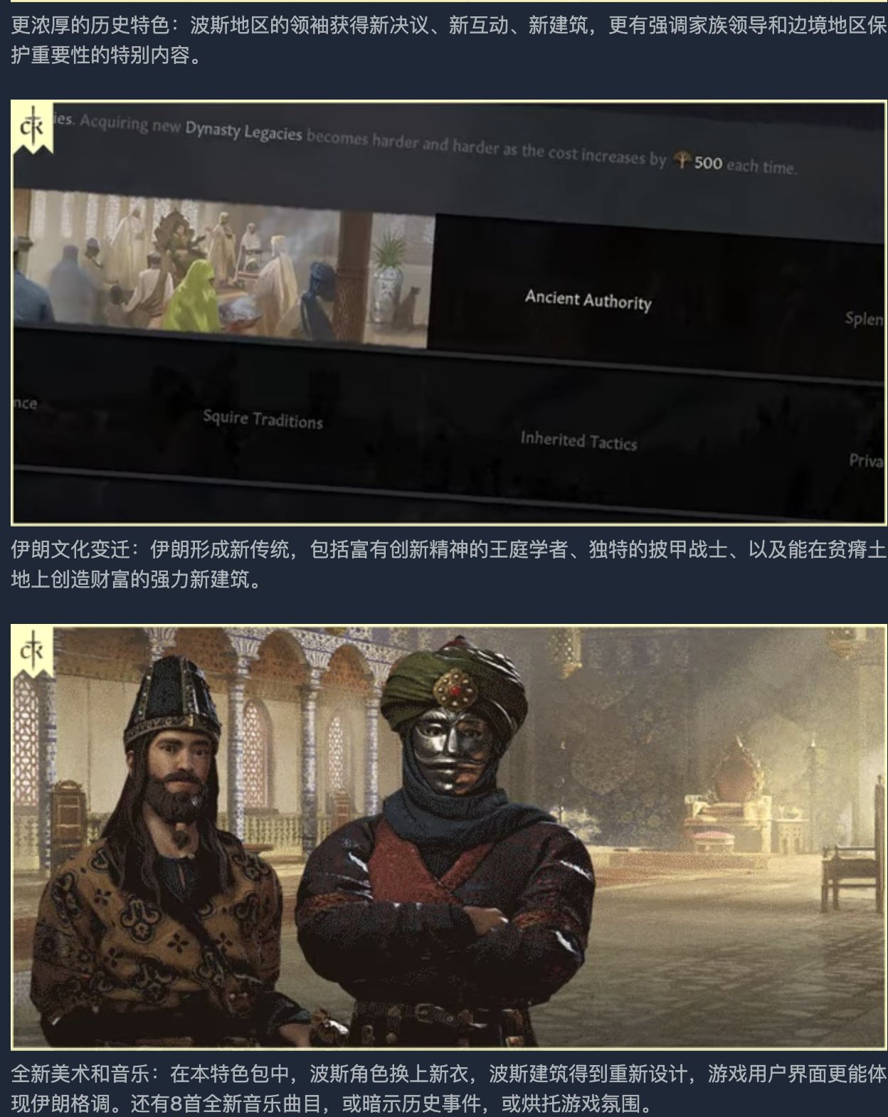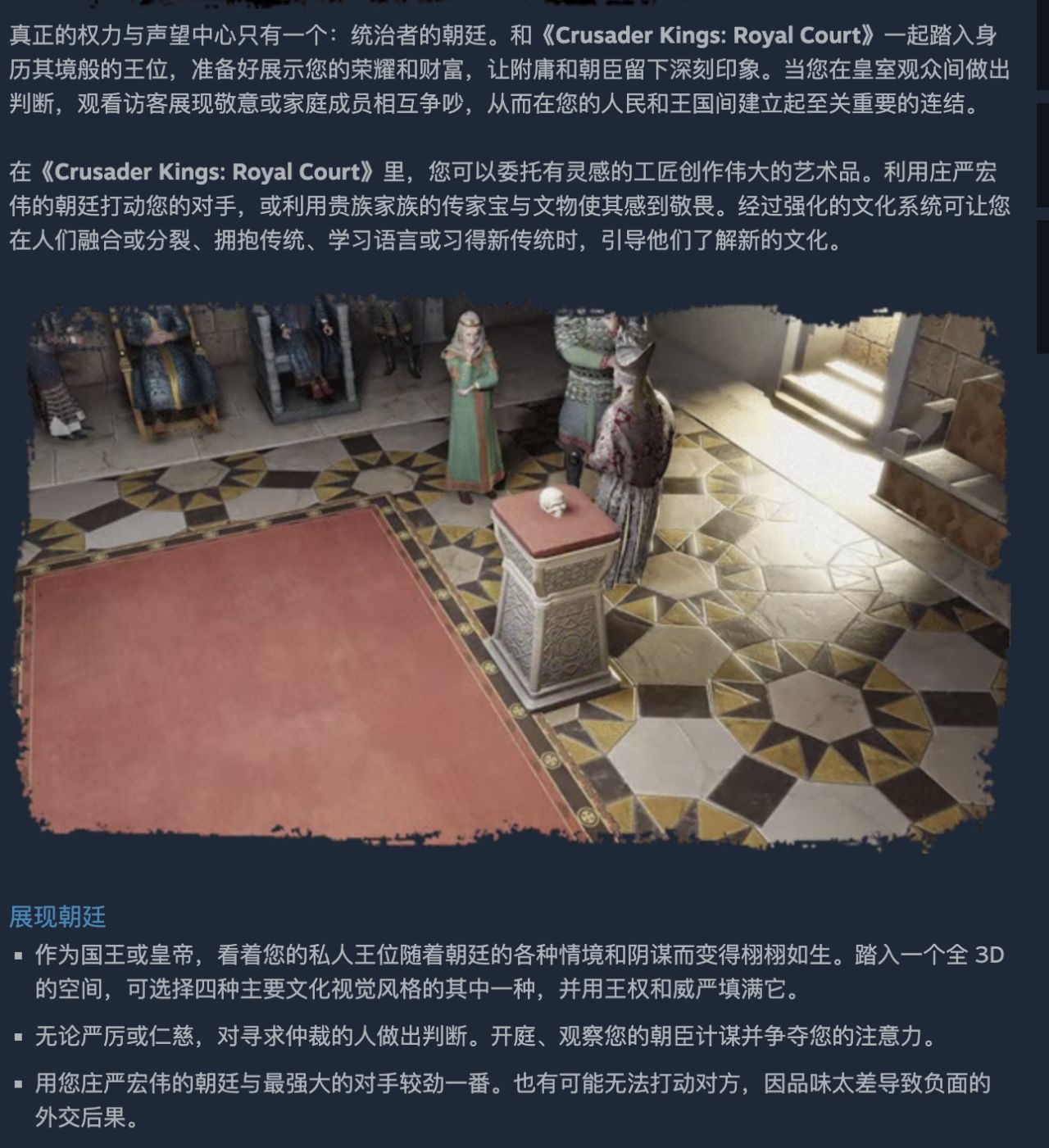第一个十字军之王的机制包,但是风评却挺烂的,主要还是点子是有的,但是事件和机制过于单一了,玩多了宫廷,你就知道,朝会内容无非是那几种。但是由于宫廷dlc解锁了文化融合和分离,还有宫廷系统,这些在十字军之王中比较核心的内容,所以这个dlc还是非常重要的。