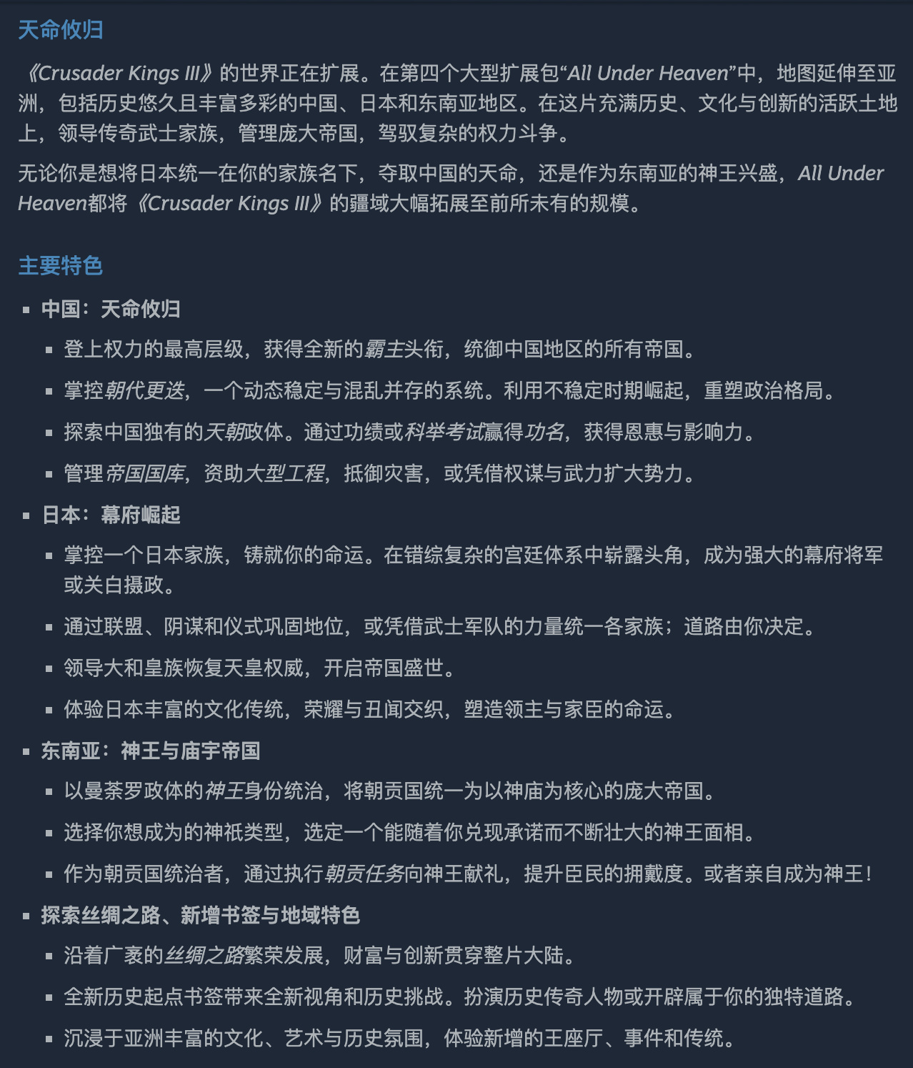 扩图以及增加天朝,日本,东南亚多方势力,作为十字军之王最受期待的dlc,这次dlc的表现可以说各位令人瞩目。