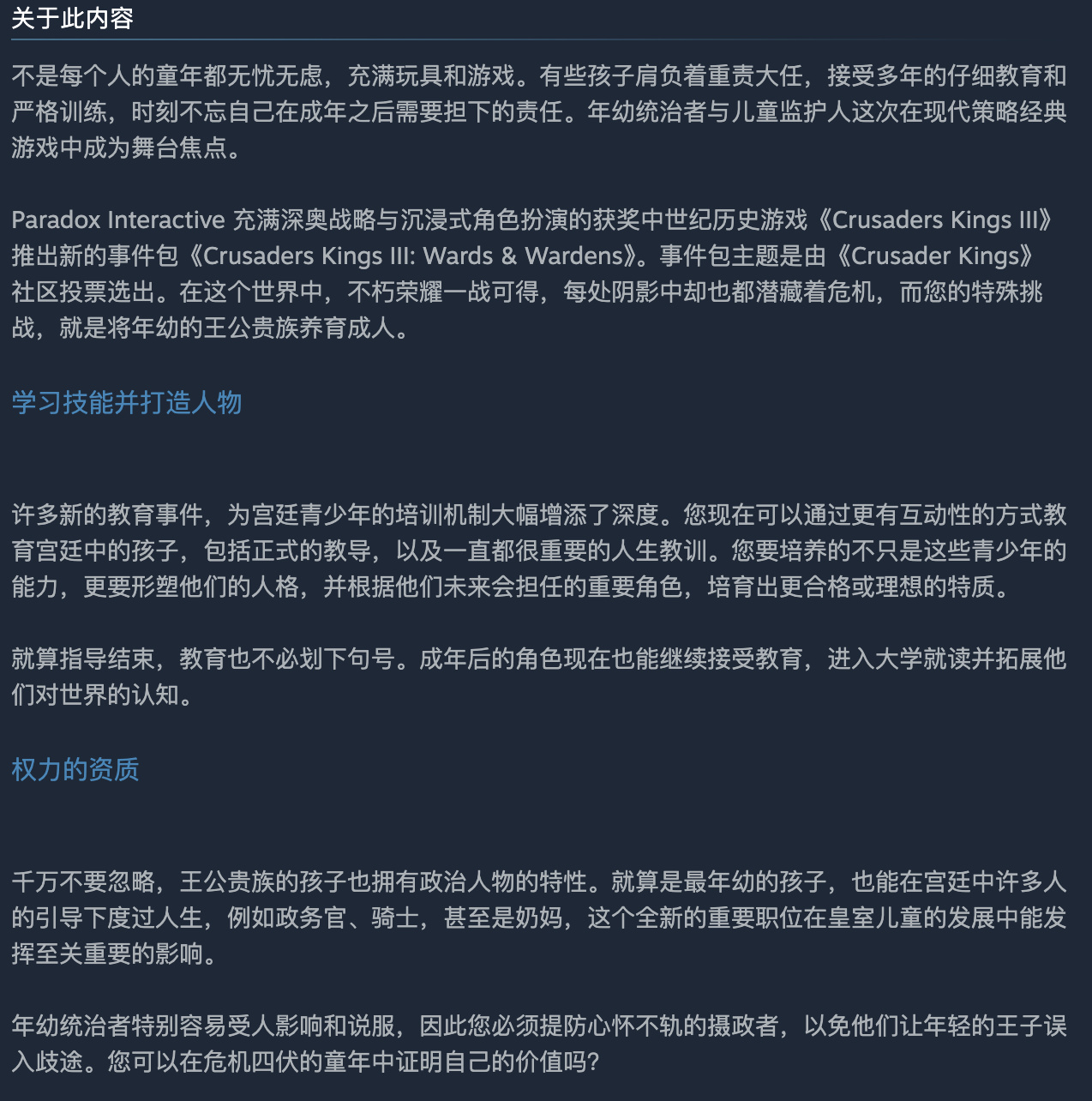 欢迎各位玩家来到目前十字军之王dlc的最高峰——权力之路,作为十字军之王挽回风评以及目前风评最好的一个dlc,本dlc的内容是相当丰富的,并且解锁了行政制和流浪者这两大关键机制,反正我现在大多数情况是能转行政就转行政,当然,这个dlc由于在算法方面的问题,导致本作之后,游戏的配置需要大幅提高,所以要看你的电脑能不能吃的下。