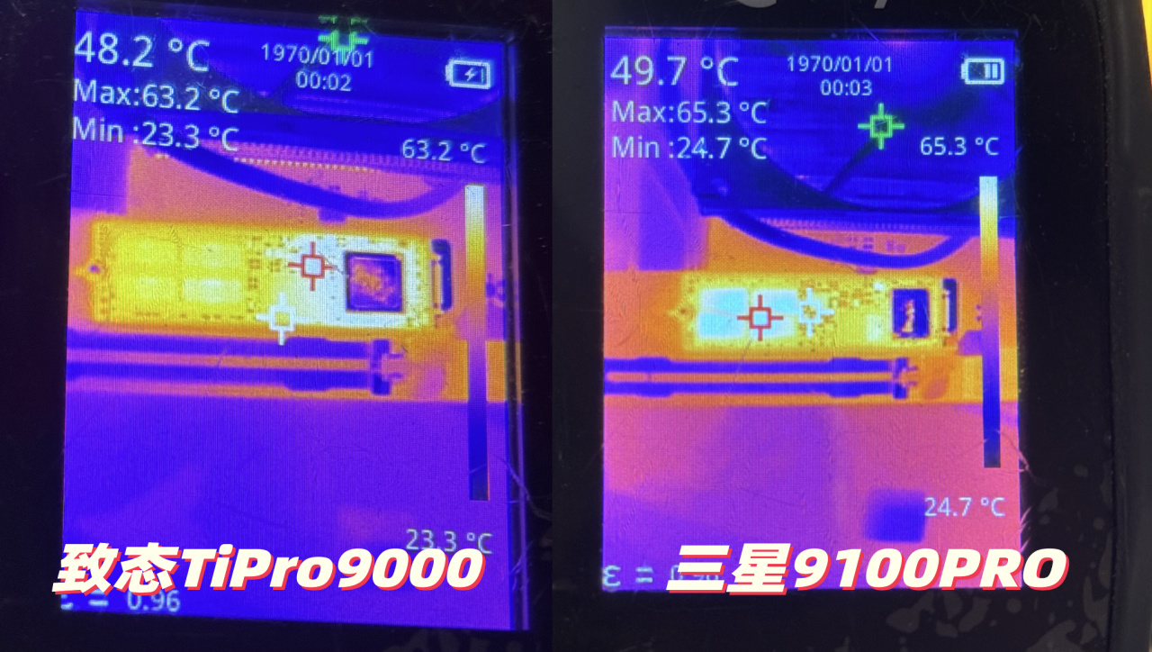 從圖中也可知,致態TiPro9000最熱的部位應該是其電源管理(紅色準星位置),而三星9100PRO最熱的部分是在閃存顆粒上。我個人覺得,在這個角度上看,致態會更穩定一些。
