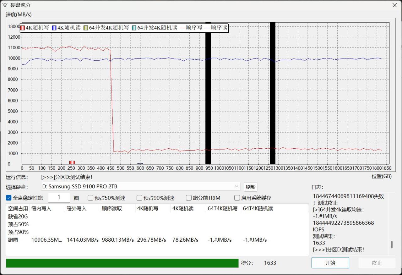 三星9100PRO在寫入測試中(紅色波浪線),跑到約460GB的時候,速度降到了1400MB/s左右(TLC直寫階段,1200~1400範圍內浮動),也就意味着三星9100PRO的緩外平均寫入性能只有1412.39MB/s。