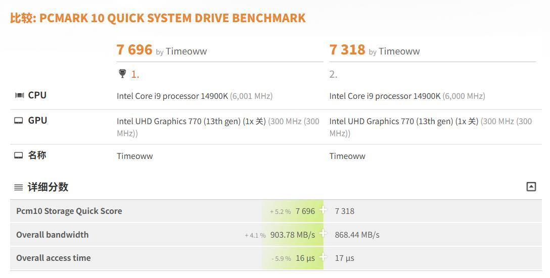 我使用PCMark10專業版中的快速系統盤基準測試項目(Quick System Drive Benchmark)對兩個盤進行了幾輪測試,這個測試項目主要測試了受試硬盤的生產力性能,結果如下(測試結果都經過了PC MARK官方系統驗證並上傳到了平臺的數據庫中):
