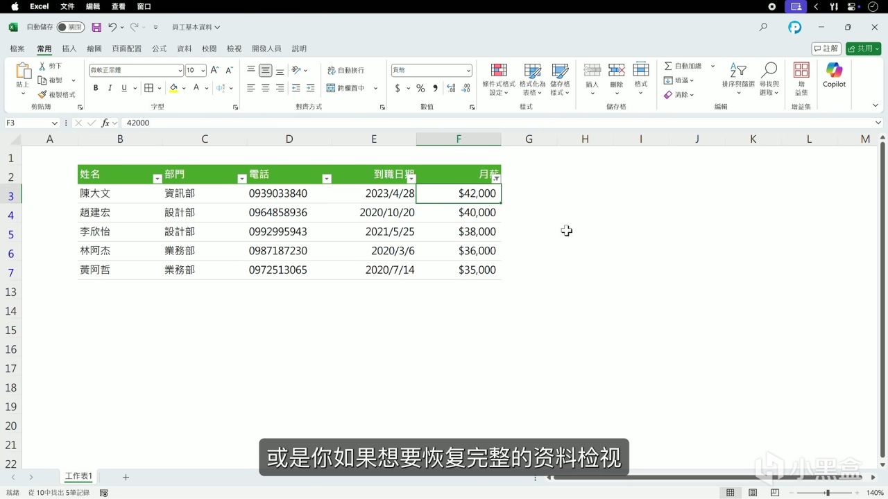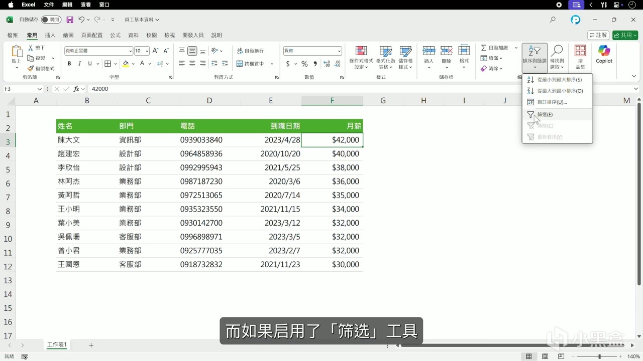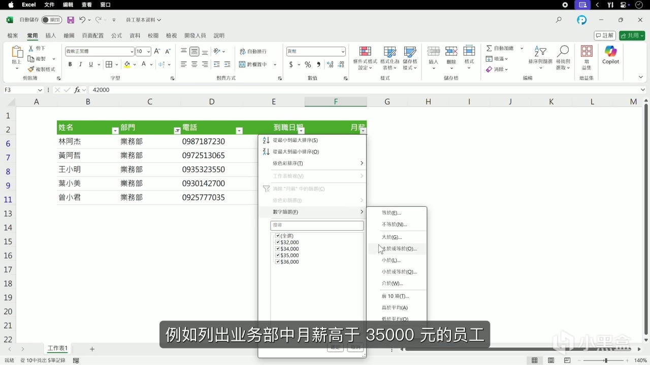 按數字篩選:點擊“月薪”列的箭頭,選擇 數字篩選 -> 大於,並輸入 35000,以篩選出月薪高於 35000 元的員工。