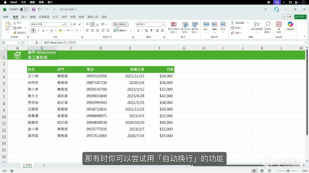 • 自動換行 (Wrap Text):使文字在單元格內自動分行顯示。