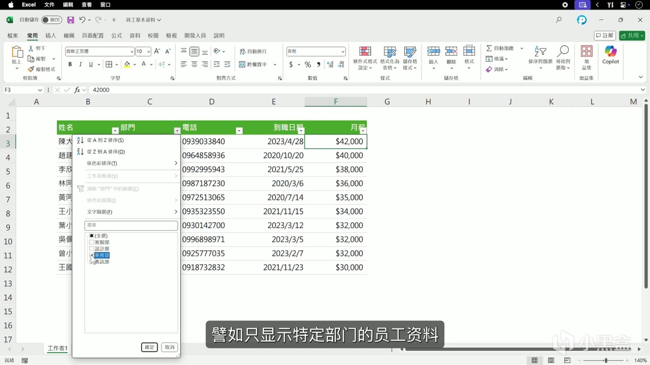 按文本篩選:點擊“部門”列的箭頭,只勾選“業務部”以顯示該部門的員工。