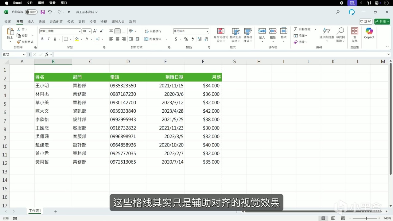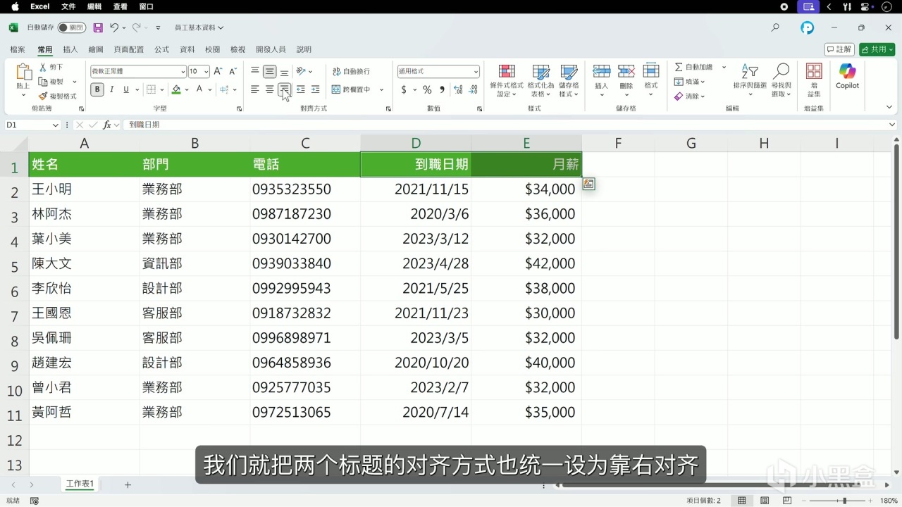 • 操作:將標題的對齊方式(如“到職日期”和“月薪”應設爲“靠右對齊”)與下方數據的對齊方式保持一致。