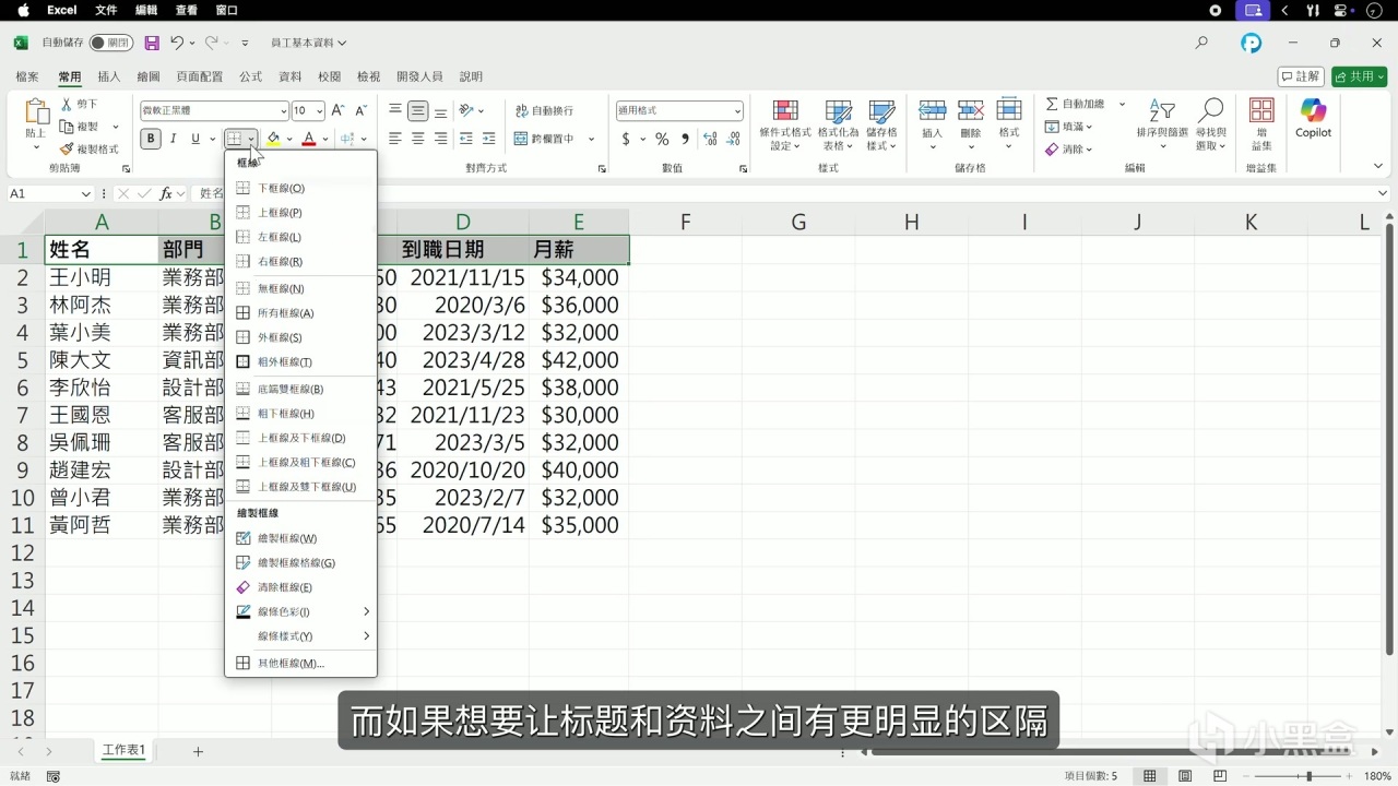 • 添加框線 (Borders):在標題下方添加一條粗框線,以區分標題和數據。