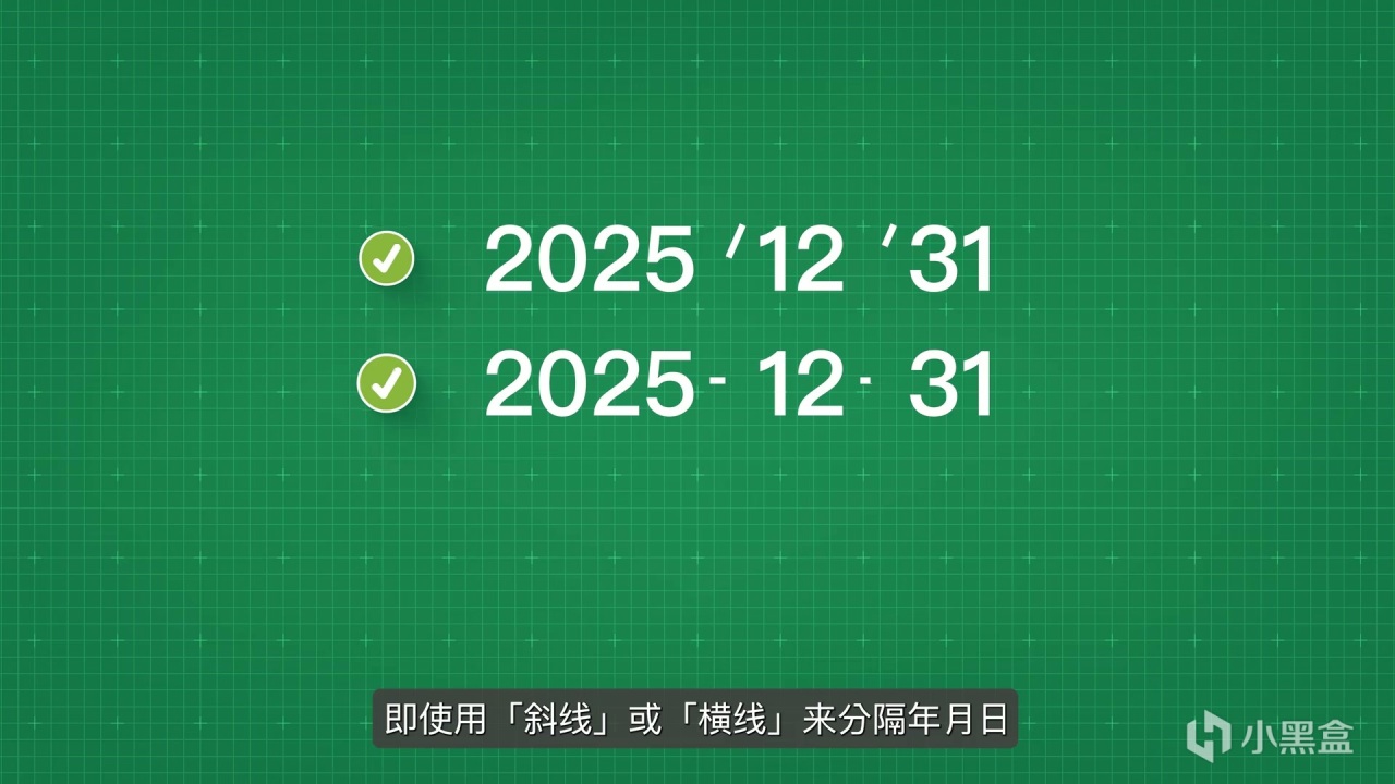 • 錯誤格式:使用逗號 (,) 或小數點 (.) 會導致 Excel 將其視爲普通文本,影響後續的日期計算和排序。