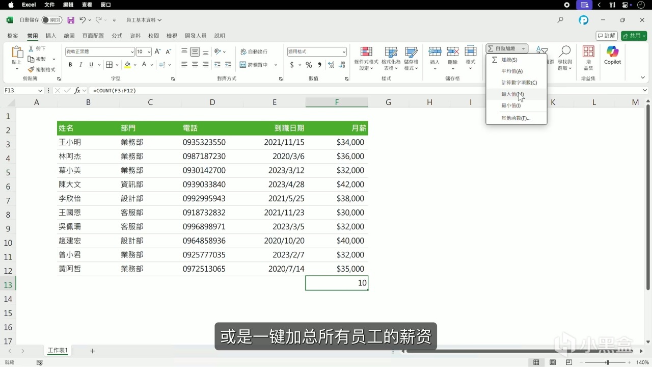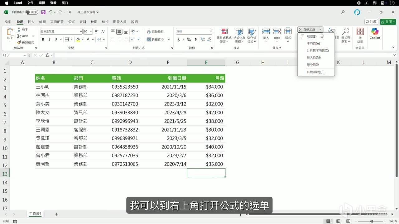 • 操作:選中數據列下方的單元格,點擊右上角的 Σ (AutoSum) 自動求和下拉菜單。