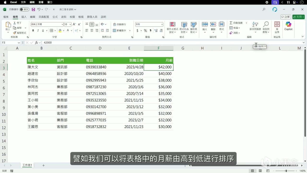 • 排序 (Sort):可以按任意列的數據進行升序或降序排列,例如按月薪從高到低排序。