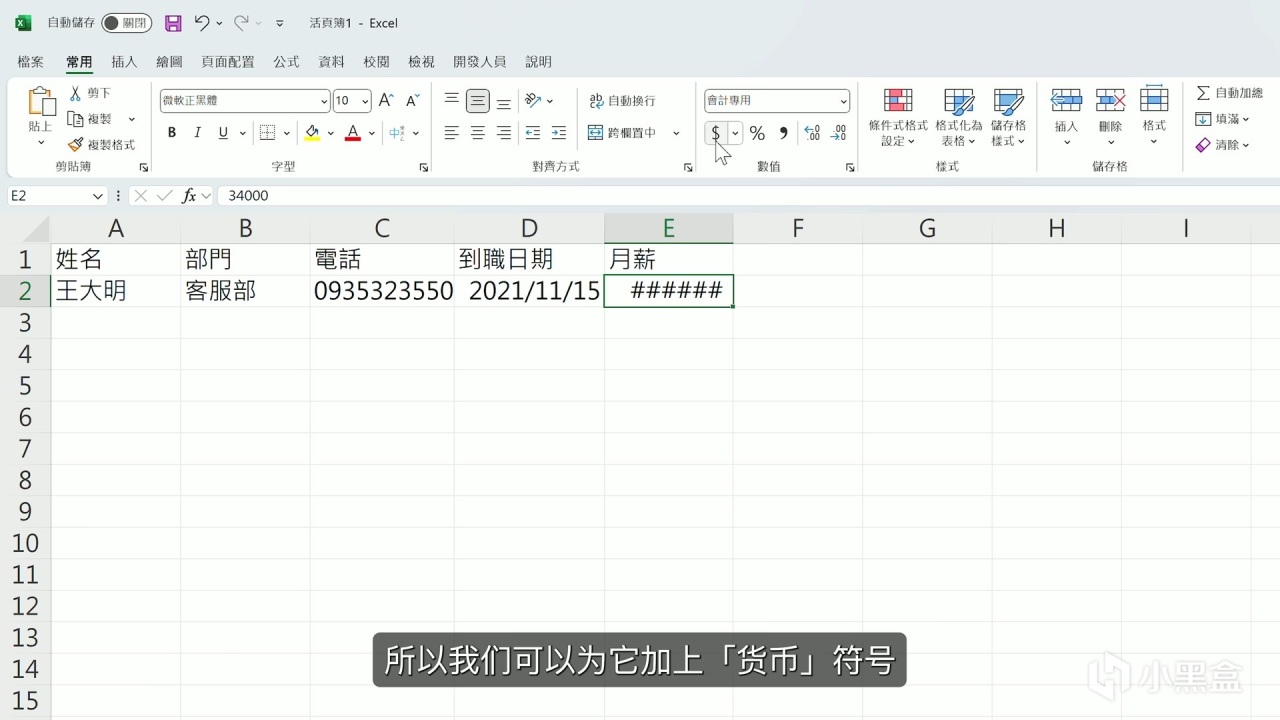 • 問題:爲金額設置貨幣格式後,如果列寬不足以顯示完整數字,單元格會顯示一排井號 #######。