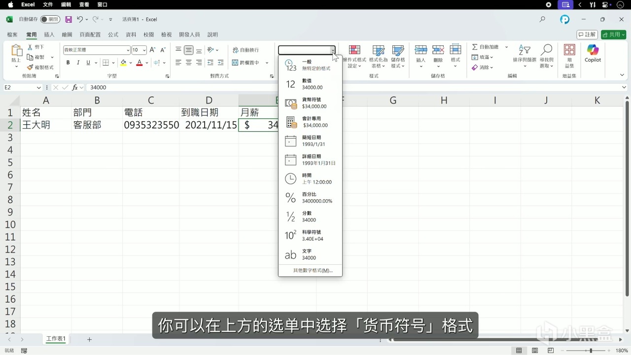 • 貨幣格式 (Currency):貨幣符號緊貼在數字前方。