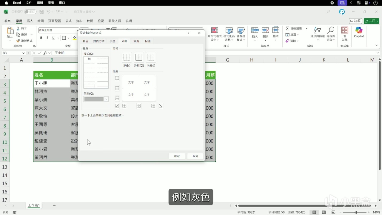 在彈出的窗口中,選擇框線的 樣式 和 顏色(如灰色)。