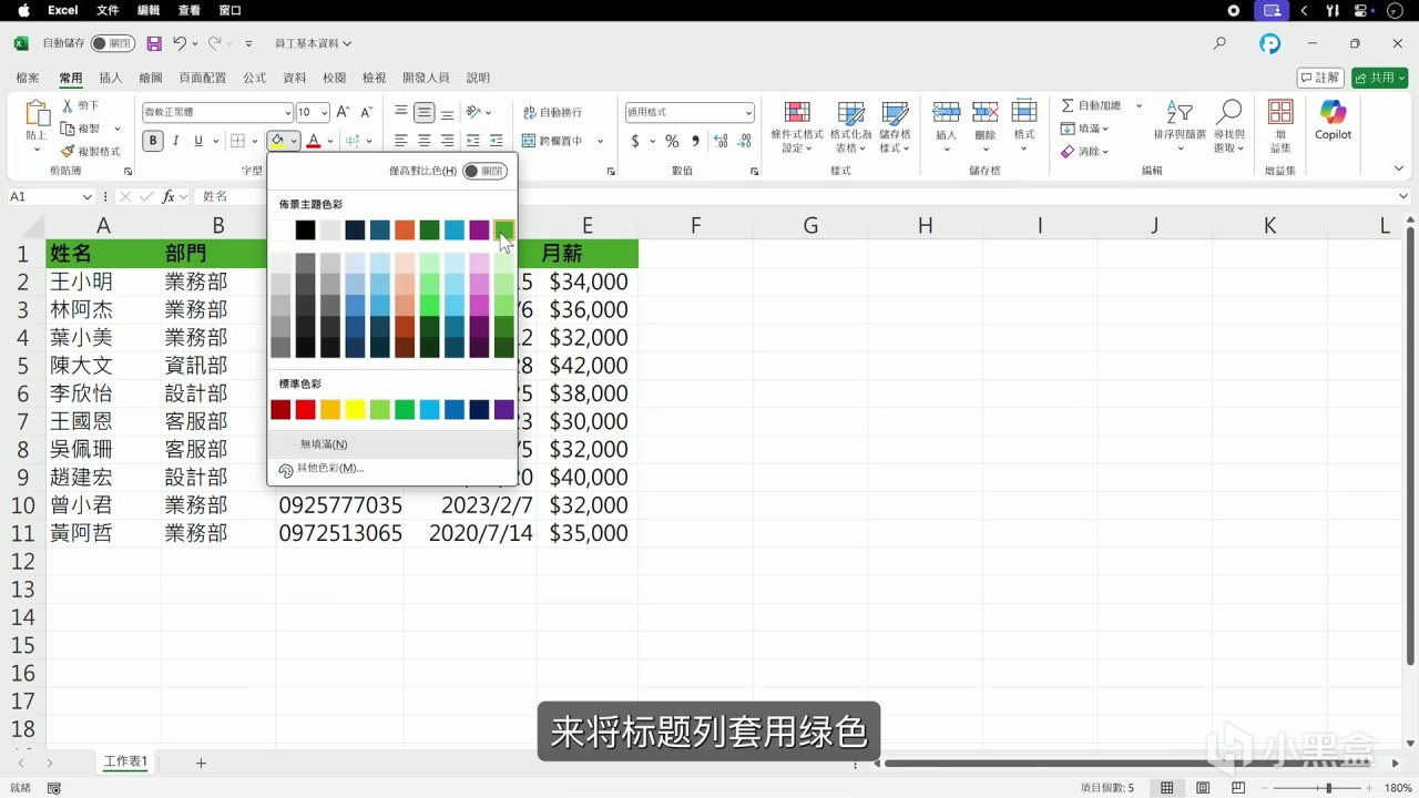 • 填充背景色 (Fill Color):爲標題行設置背景色(如綠色)。