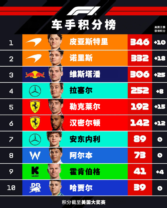 车手积分榜,维斯塔潘距离榜首追到只差40分,诺里斯也缩小差距来到14分。