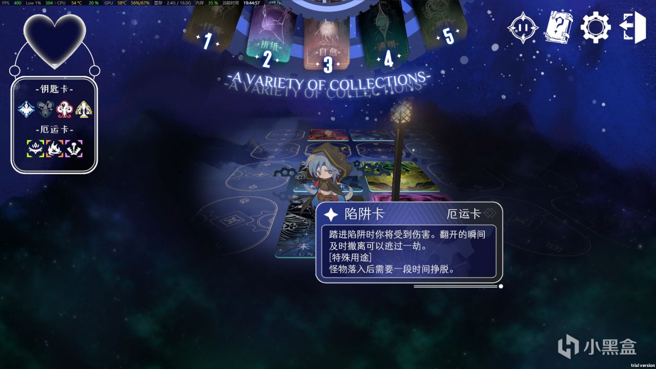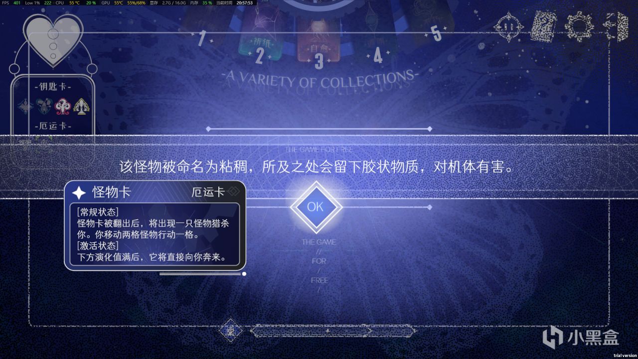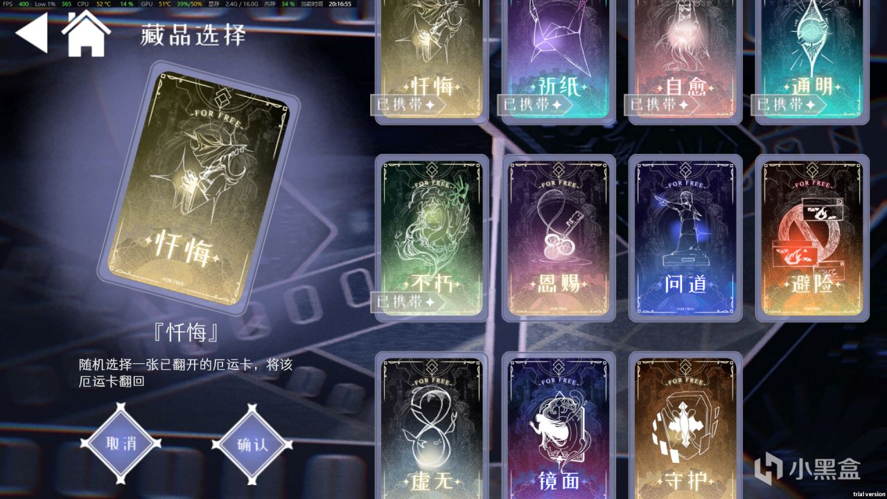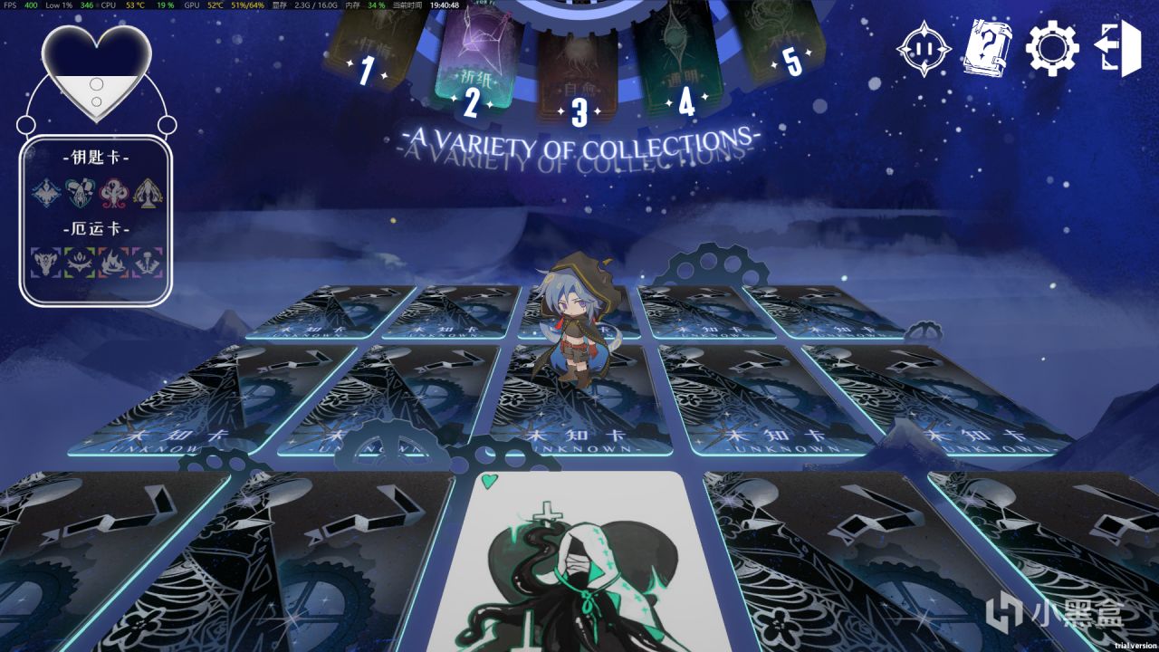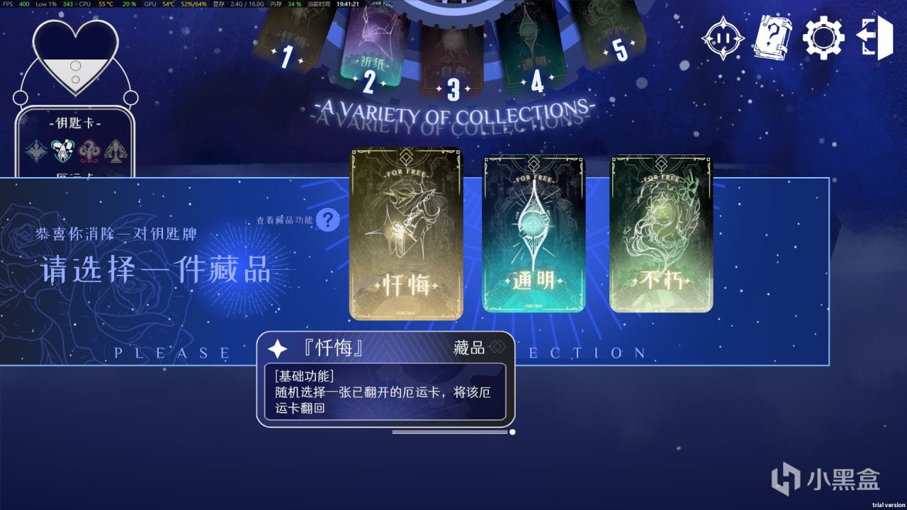 當我們成功翻牌相同的卡牌之後,就會進入三選一的藏品。藏品有各種各種的功能,而在準備環節我們可以選擇各種各樣的鑰匙卡,例如“懺悔”可以隨機合上一張劣勢牌(負作用牌翻到正面,就無法自動合上)。“不朽”可以讓你保持真男人幾秒鐘。“自愈”則是恢復你一定量的血量,有的甚至可以透視腳下的卡牌,或者是周圍卡牌的數量。在準備關卡標註了關卡會產出的怪物,根據情況挑選適合的即可。