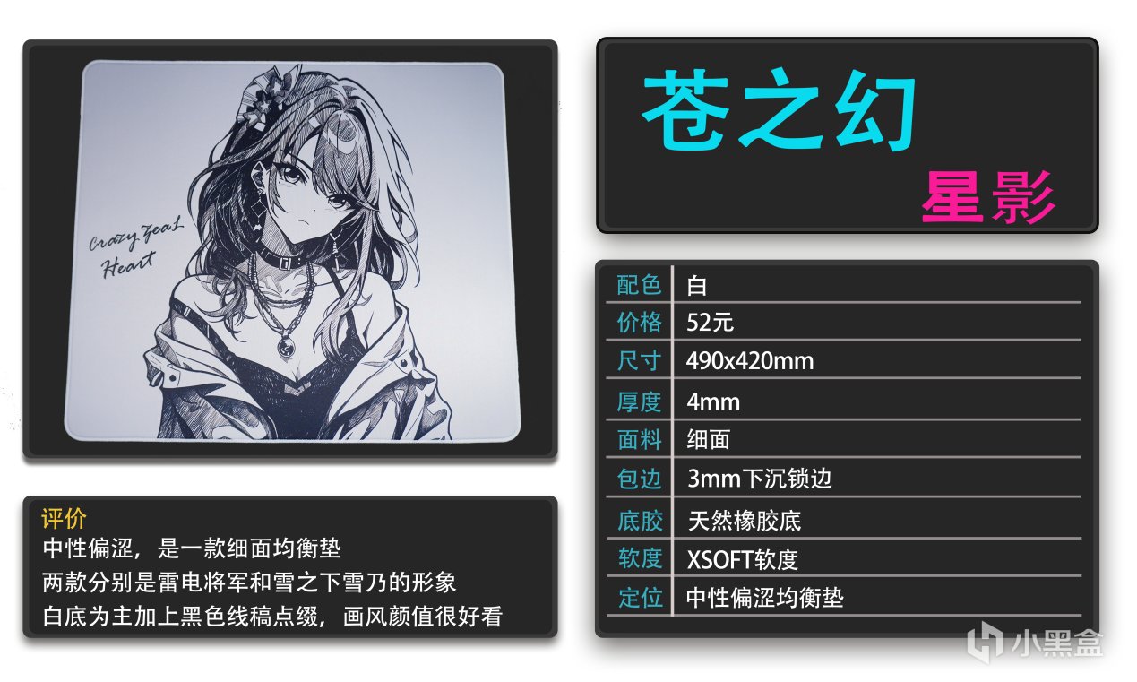 做的是類99式面料,價格還是非常不錯的。“雪”、“影”這兩個款式應該可以看出來是《我的青春戀愛物語果然有問題》裏面的雪之下雪乃,以及《原神》裏的雷電將軍了,每款都贈送了一張名片。這是一款中性偏澀,均衡偏控制的墊子,黑色線稿看着比較舒服,流行風格的影大人真的愛了。