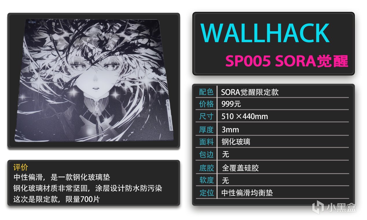WALLHACK SP005SORA覺醒將於10月29日發售,這是SP005系列的首發,也是限定款,國區首發700片,售價999元,經典的黑白款需要等後續發佈(非限定)。這是一款鋼化玻璃鼠標墊,當然適用人羣還是富哥以及對於鼠標墊有着頂級需求的人們。