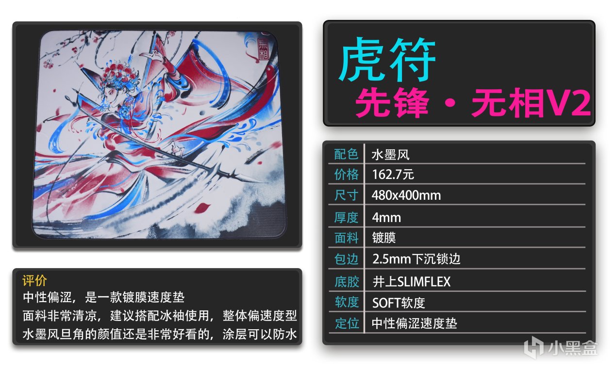 相比於布墊來說,這個墊子更接近於樹脂墊的手感。摸起來非常冰涼,建議帶冰袖以及冰板腳貼使用。要注意的是不能在墊子上放高溫物品,會影響到表面鍍層,並且要注意的是不看反捲,也會損壞鍍層。以傳統戲曲中的“旦角”爲參考形象,加上水墨風格,整體顏值不錯,富有張力,看起來非常颯爽。這是一款中性偏澀的速度墊,整體速度比較快,SlimFlex底膠,防滑性能優秀。最後就是贈送了一張99小時某加速卡。