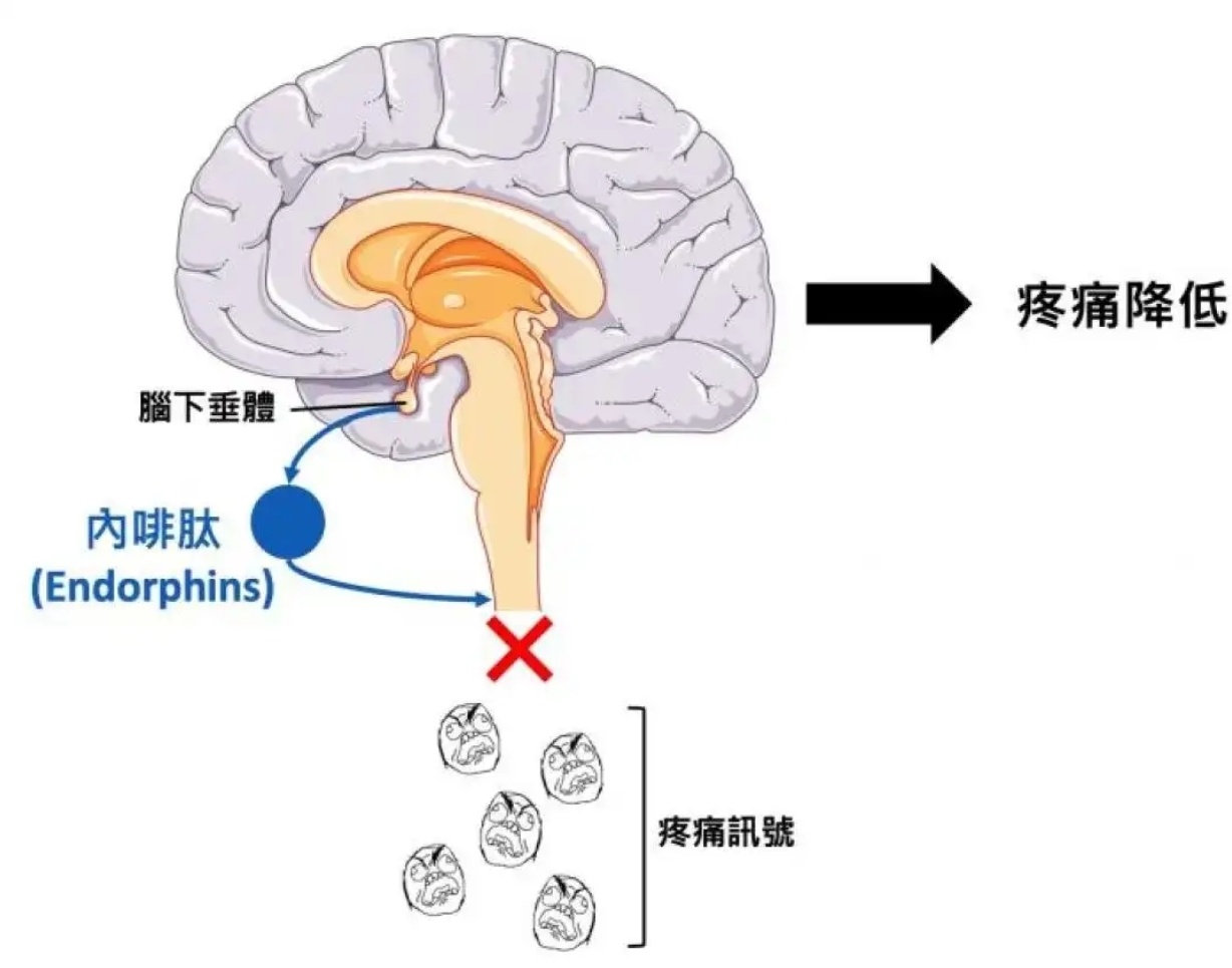 与此对应,人体中还有一个抗痛系统,这个系统不仅会通过神经发出抑制疼痛的信号,体液中还会分泌出内啡肽、强啡肽等物质。这些物质的作用类似于吗啡,会帮助人体缓解疼痛的感觉。