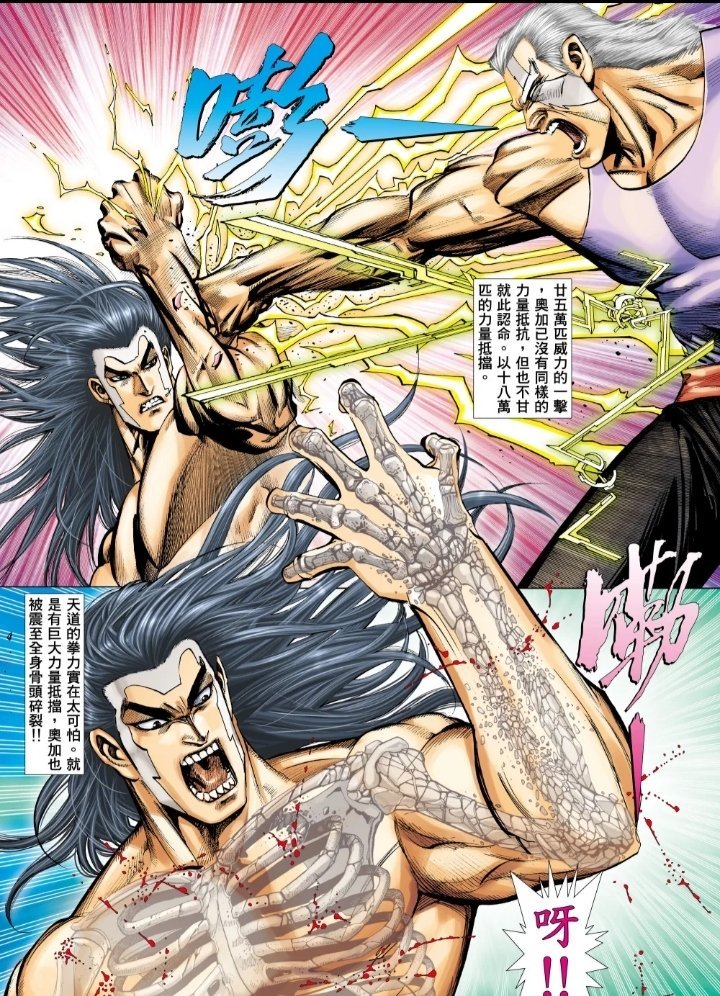 天道一拳轟碎奧加左臂,緊接着又用出相同力量的一拳轟碎奧加身軀,這時奧加才知道原來剛纔天道說的自己只剩下三擊二十五萬匹力量是用來騙自己招的。