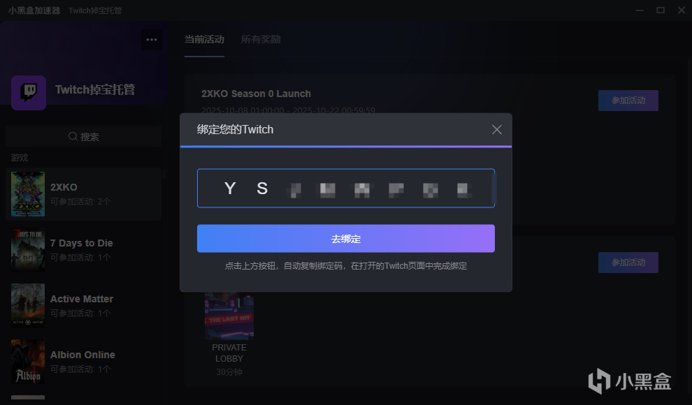 綁定成功後,查看TWITCH託管掉寶裏找尋PUBG,然後點參加,然後等時長就行了!