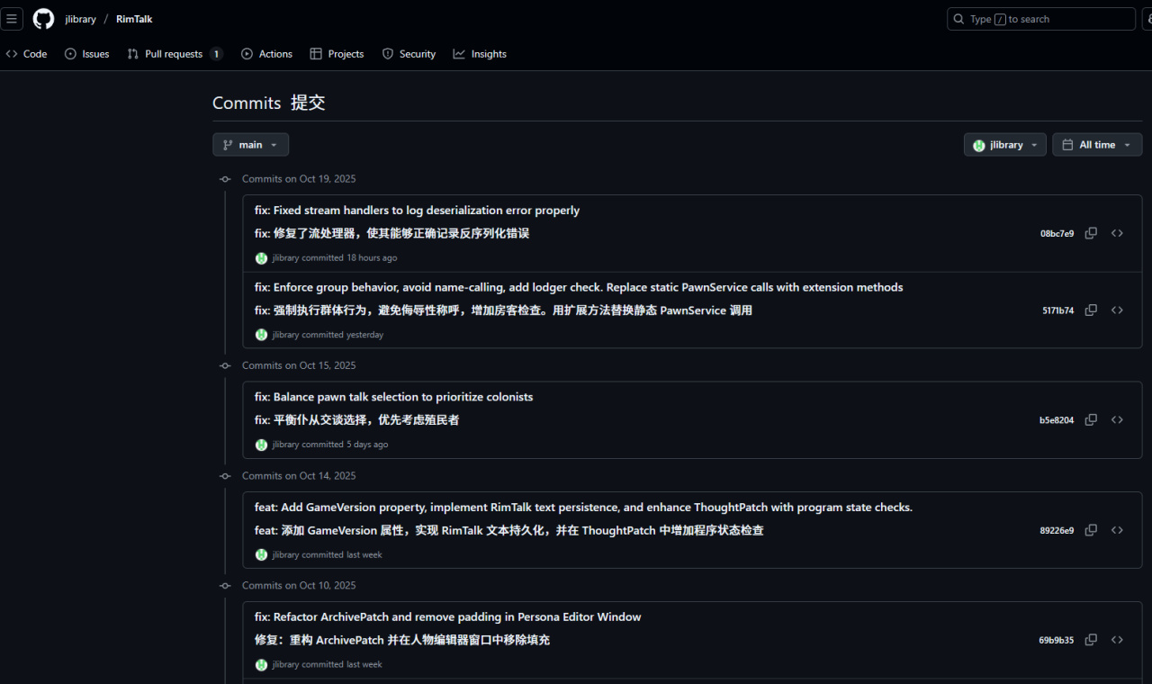 当然,RimTalk作者没“监视”我,然而是我总在“监视”他,每天都会看创意工坊他的mod是否有更新,刷他的Github查看更新日志。