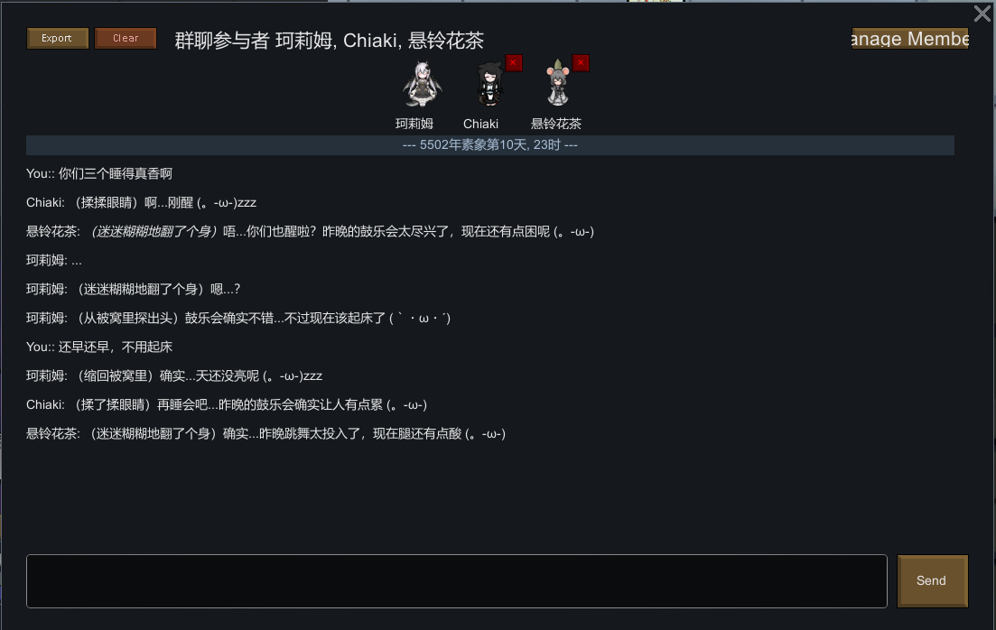 如動圖所示,先點選你想“借”誰的嘴說話,再右鍵點你想誰“回話”,即“與 xx 聊天”,在輸入框輸入後發送即可。(這裏我把chat翻譯成聊天,感覺“交談”好像更合適,我馬上去修改漢化mod)