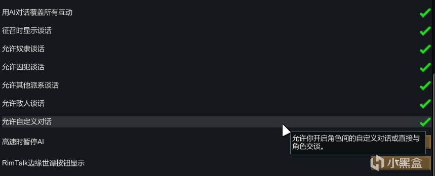 说回番外篇正题,把RimTalk更新到最新版本后(汉化mod边缘世谭我也更新了),先进mod设置页面勾选“允许自定义对话”。