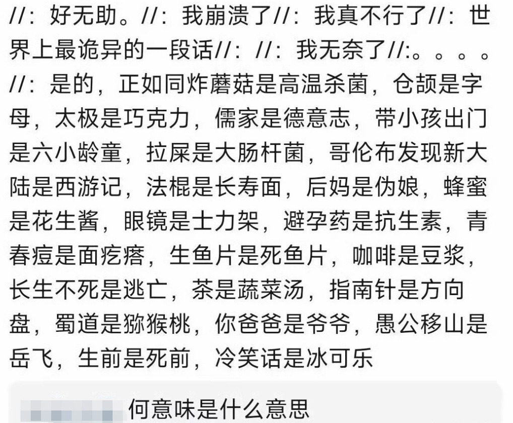 如果何意味出现在有一个可以被人类理解的正常问题语境下,那么可以确定说这句话的人仍然只是何意味无症状感染者,虽然开始玩梗,但还没有被何意味反噬。