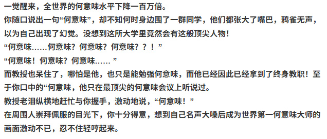 同时,何意味早期的各种抽象定型文也是这次hyw资历大赛旗下的征文项目,包括《全世界何意味水平下降100万倍,只有我保持不变》《小镇唯一何意味过的人》《坐拥千亿意味的爷爷去世了》等长文虽然但看起来莫名其妙,但综合起来看不难发现它们的核心主旨都是对资历的解构和讽刺。