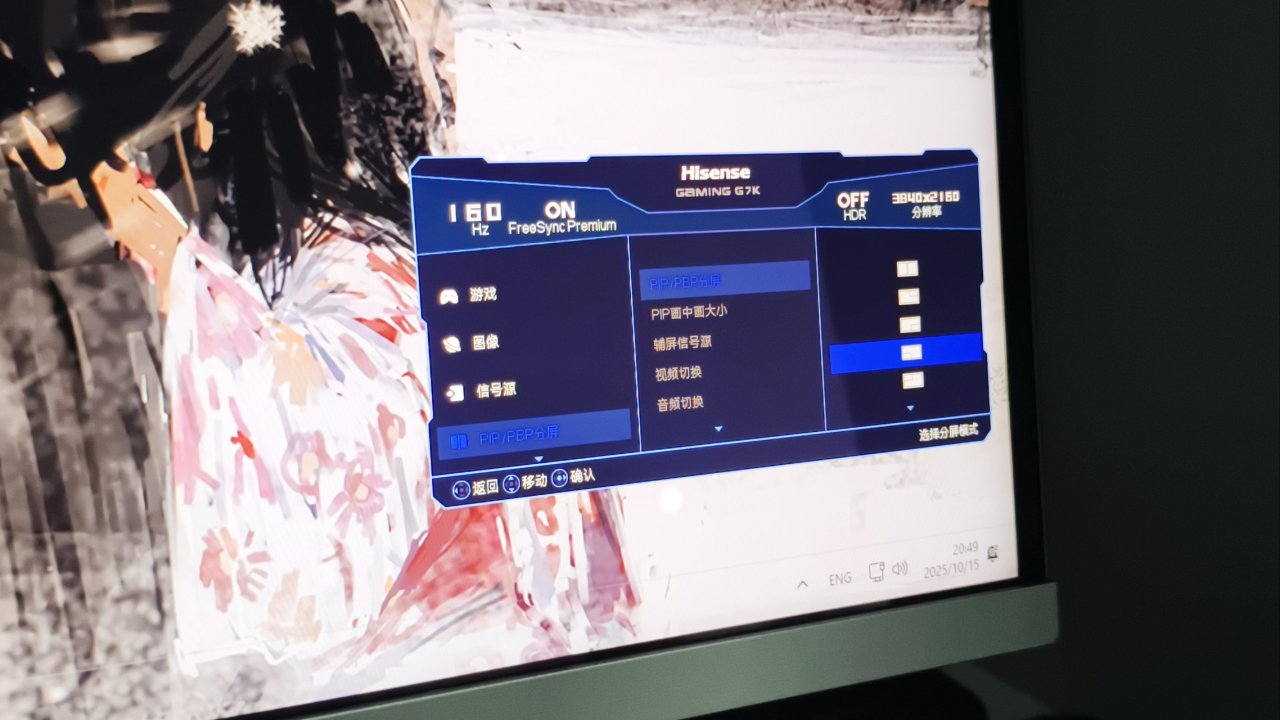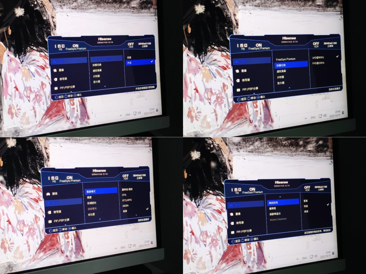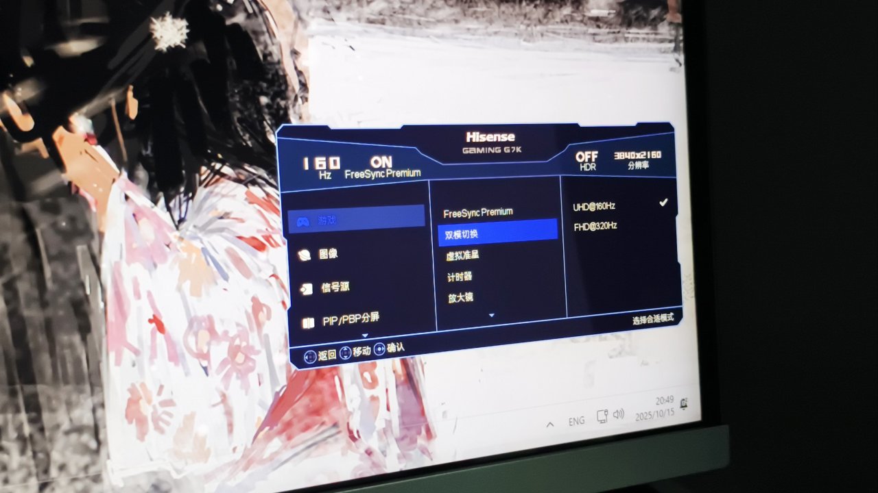 对比其他品牌而言,海信这款显示器多了一个功能,那就是双模切换功能,可以在4K 160hz与1K 320 hz之间进行一个随意切换。我认为这个功能蛮好的,我平常打瓦就用320HZ,刷新率跟得上我的电脑配置。4K 160hz日常打一些3A大作,看看电影,剪辑使用体验都不错,画面清晰。兼顾了实用性,使用范围也足够的广泛