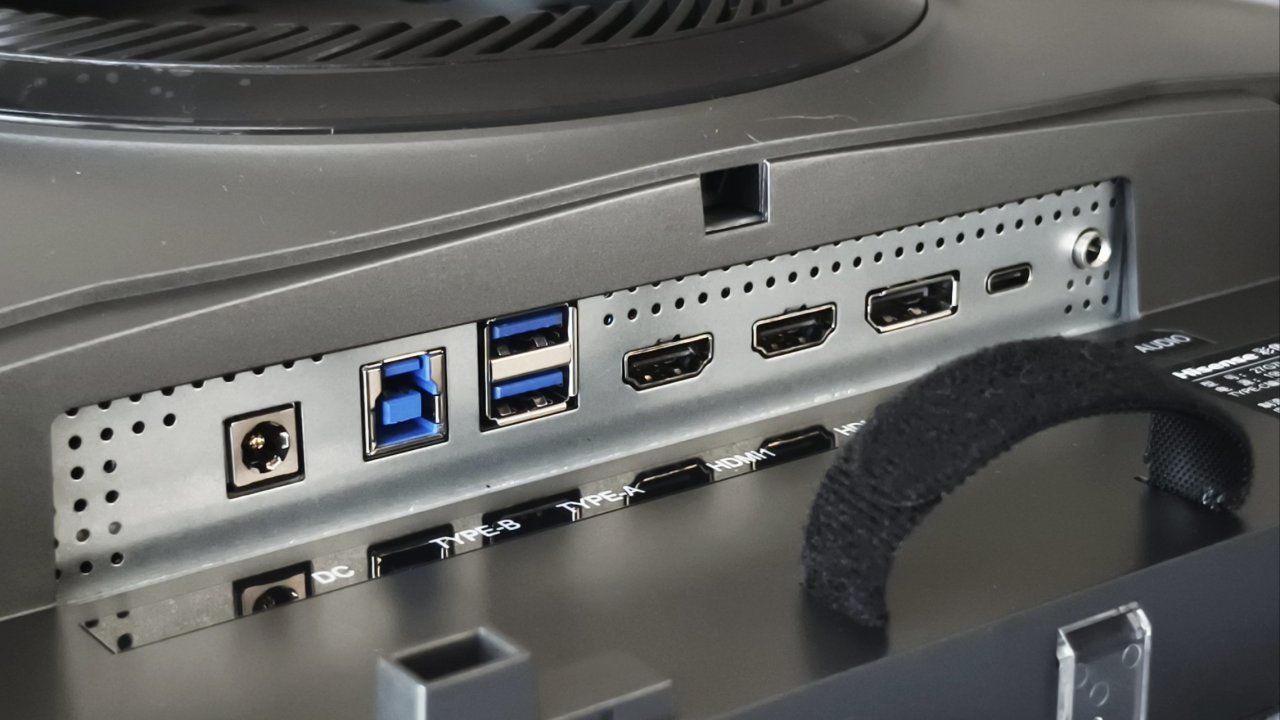 接口方面可以说相当丰富,从左到右依次是:电源接口,type- B接口,type -A接口,两个HDMI2.接口1,一个DP2.1接口,一个Type-C以及耳机接口。这个价位能给到DP2.1的接口真的蛮有诚意的,DP2.1因为拥有超大的带宽,高效的数据传输速度。因此支持无损传输,画质方面相当还原,可以减少画面卡顿与色彩断层的情况