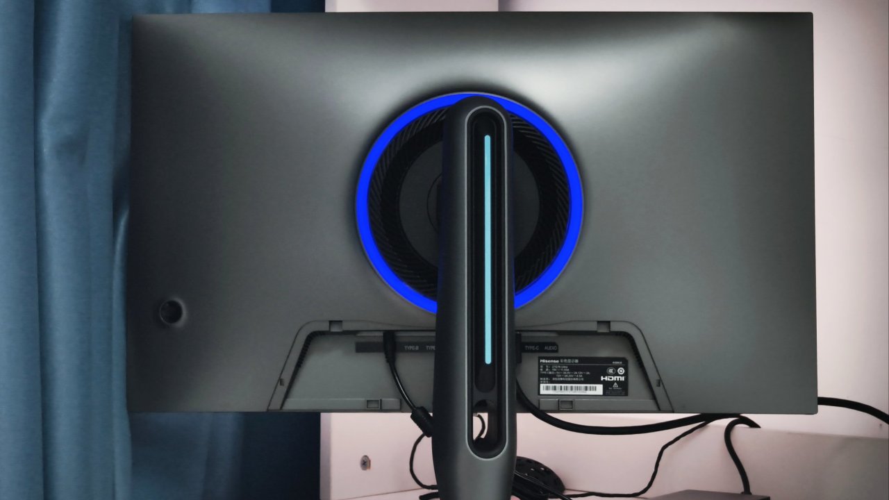显示器的背面设计的蛮简单的,不过正中间那一圈有点像是类似汽车排气或者说发动机的感觉,我还蛮喜欢的。并且在接通电源后,那一圈就会亮起,整体的氛围感非常强。如果你本来想做一个那种光污染的电竞房,选择这款显示器肯定是一个不错的选择