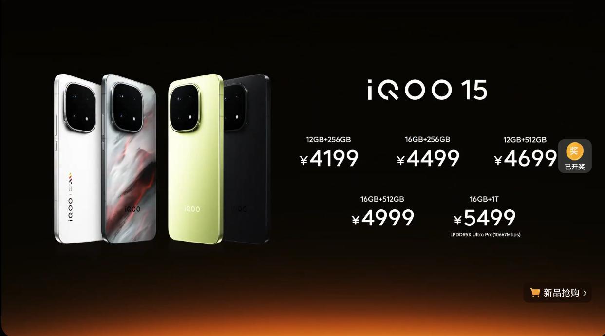 价格方面,iQOO 15 12GB+256GB版本售价4199元;16GB+256GB版本售价4499元;12GB+512GB版本售价4699元;16GB+512GB版本售价4999元;16GB+1TB版本售价5499元。