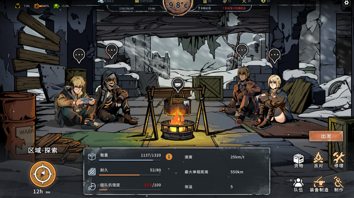 出发前,需要准备队伍的燃油和食物。每到一个庇护所时,队伍会休息。游戏中设有饱腹值和压力值,当饱腹值耗尽时,可以使用携带的食物,煮熟后补充饱腹感;当压力值升高时,可以使用酒类或日用品来降低队员和自身的压力。