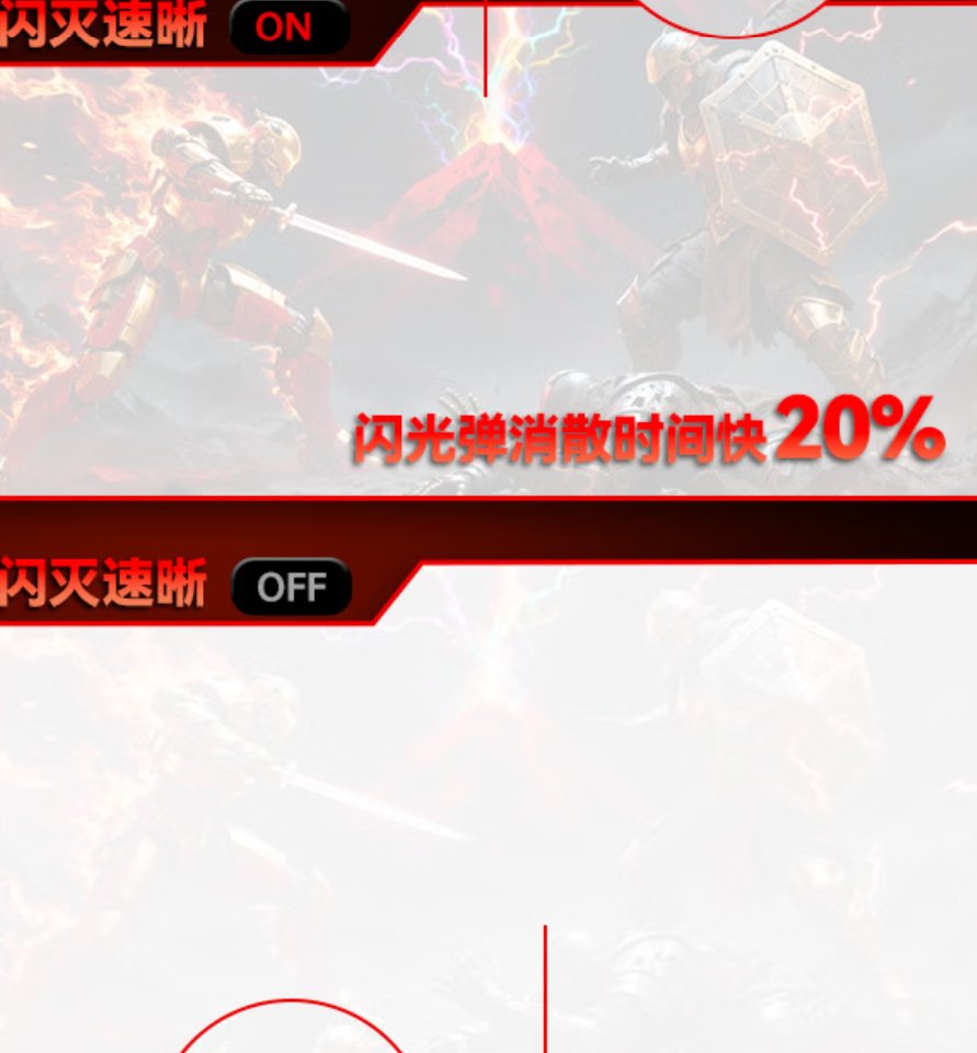 既支持最新的DIC 2.0动态模糊消除技术,消除运动模糊和拖影,也有专为FPS游戏设计的闪灭速晰功能,能加速闪光弹消散时间。具体是通过AI实时追踪画面动态,提前捕捉屏幕闪光信号,智能调节画面,据称能让闪光弹消散时间加快20%。