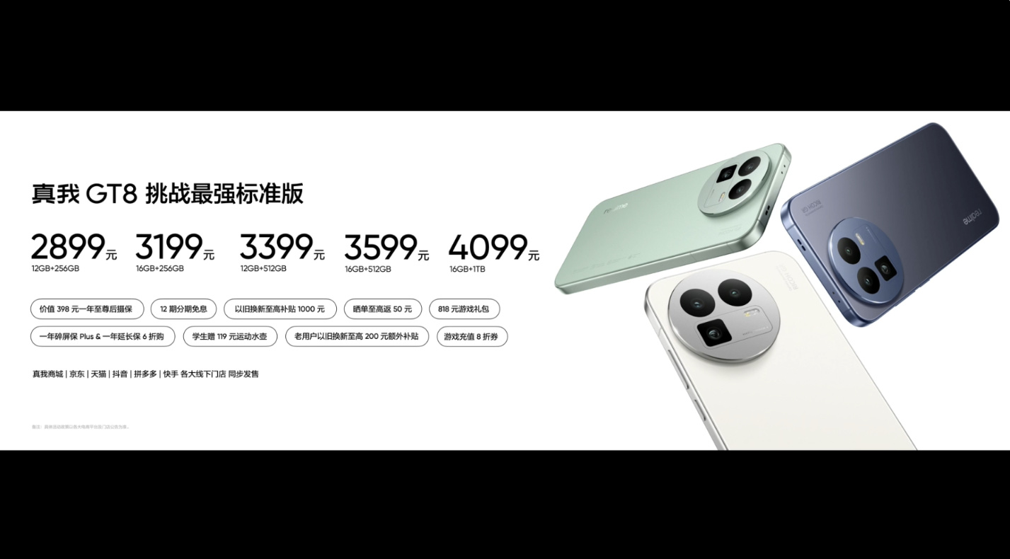 價格方面,真我GT8 12GB+256GB版本售價2899元;16GB+256GB版本售價3199元;12GB+512GB版本售價3399元;16GB+512GB版本售價3599元;16GB+1TB版本售價4099元;