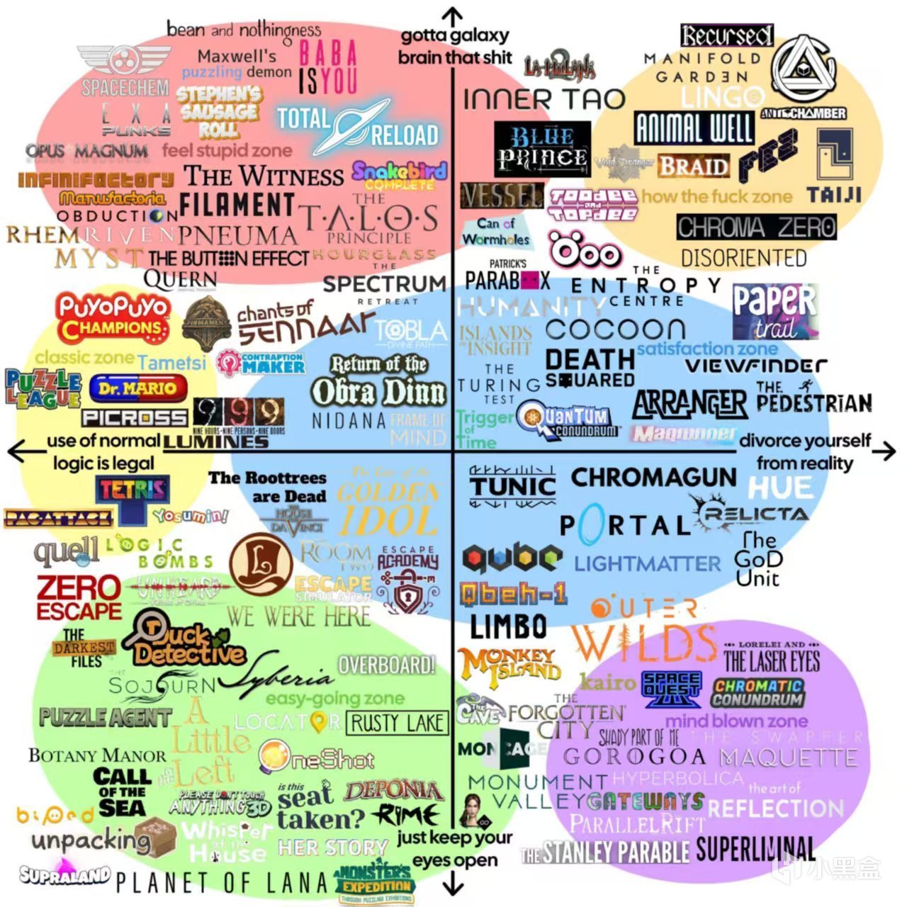 这个坐标图前段时间在各个群都在传,刚好做完类银那个图后想起这个图,所以今天顺手也把它整理好了。图的话用的是原文,感觉之前版本的翻译会有点误导。而且我说实话这个坐标系给我的感觉怪怪的,我建议是按那个颜色区域什么什么zone去看这张图。比如左上角那一块就是比较难的,里面细分的话上面一块是推箱,左边有几个自动化,下面一部分就是第一人称的解谜游戏。比较诡异的点就是它放的近的并不一定是关系近,但有些的关系放的近的确实也近,而且它的解谜是那种很广义的解谜,里面甚至会有俄罗斯方块。。。这图我是找不到什么规律的,槽点也有,周围朋友也在吐槽,就当作一个小列表找自己感兴趣的会好点。