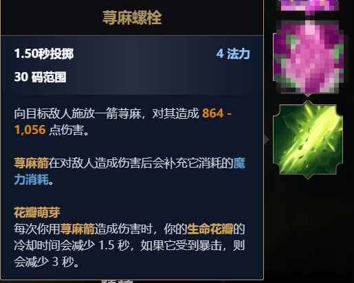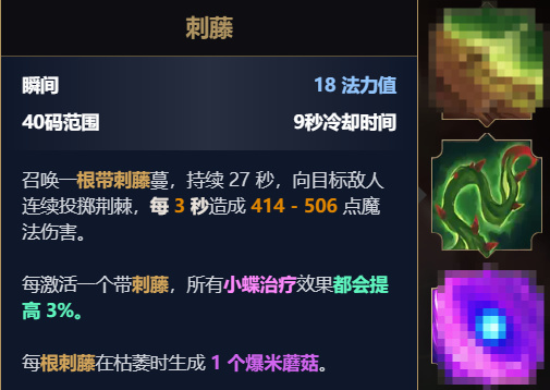 第二个则是我们的荨麻造成伤害会对我们法力值有一个1%的回复,其实在常规大环境下的收益是比较低的,因为你不点第一个荨麻本身的CD就有一定时间,性价比不高
