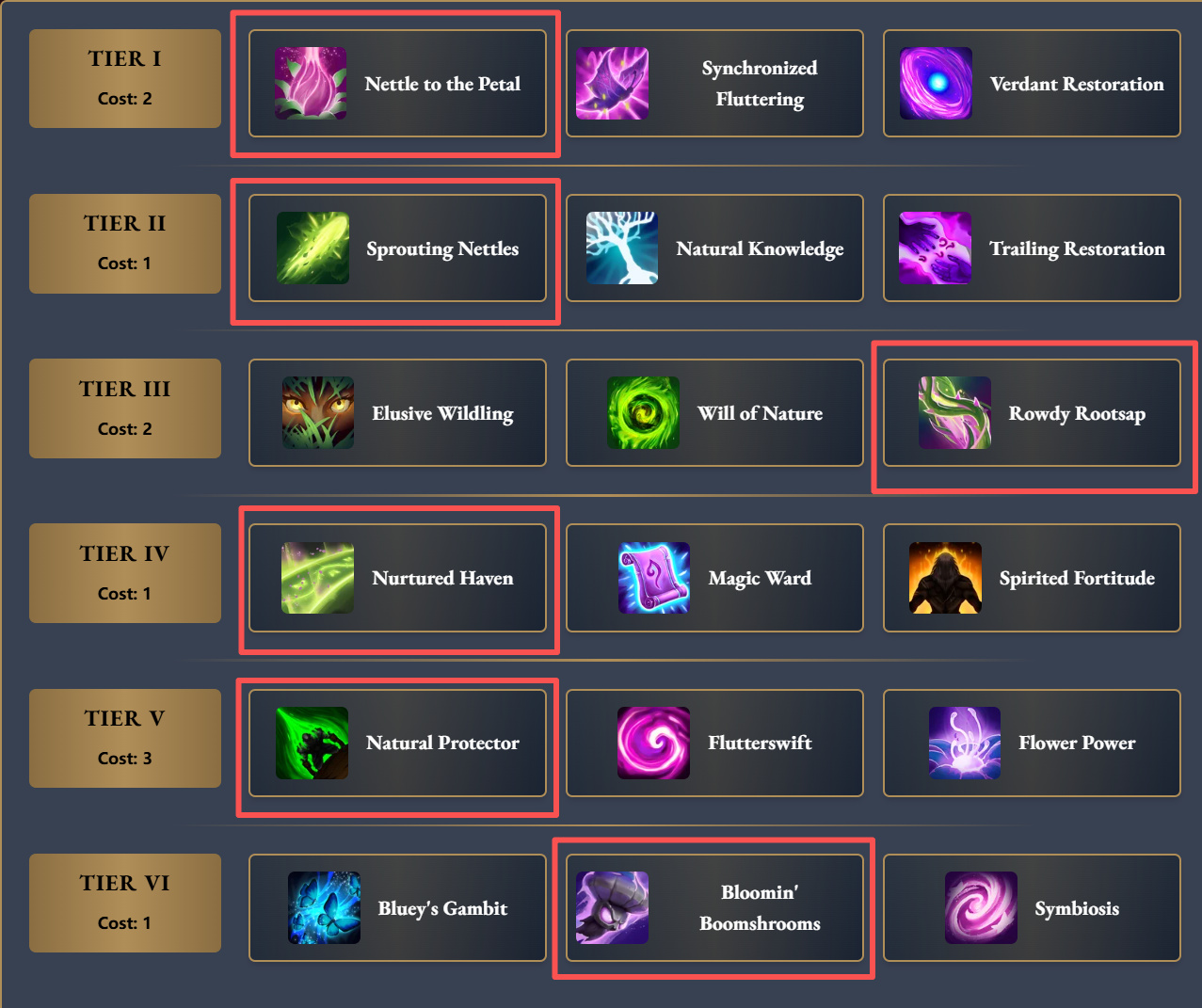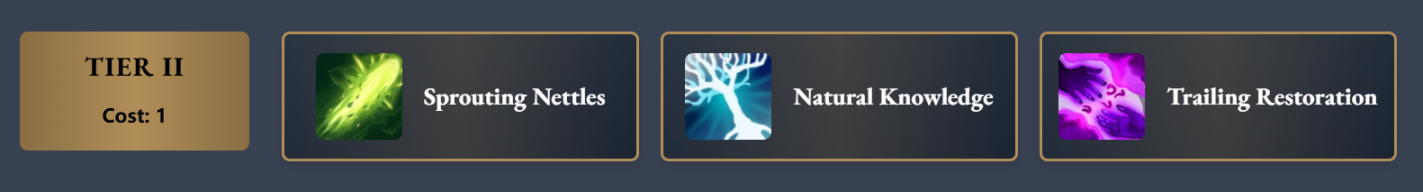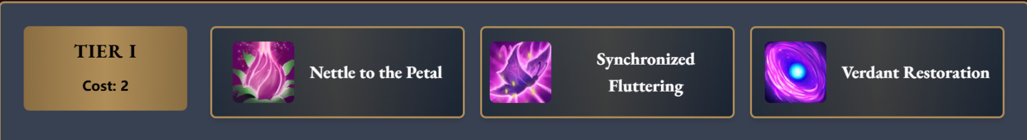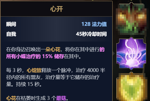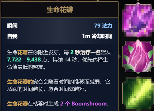 咱们先来看看第一行的天赋(从左到右),第一个天赋是我们在释放荨麻技能的时候只要命中造成了伤害就会增加我们花瓣的一个治疗量,算是补充治疗的。
