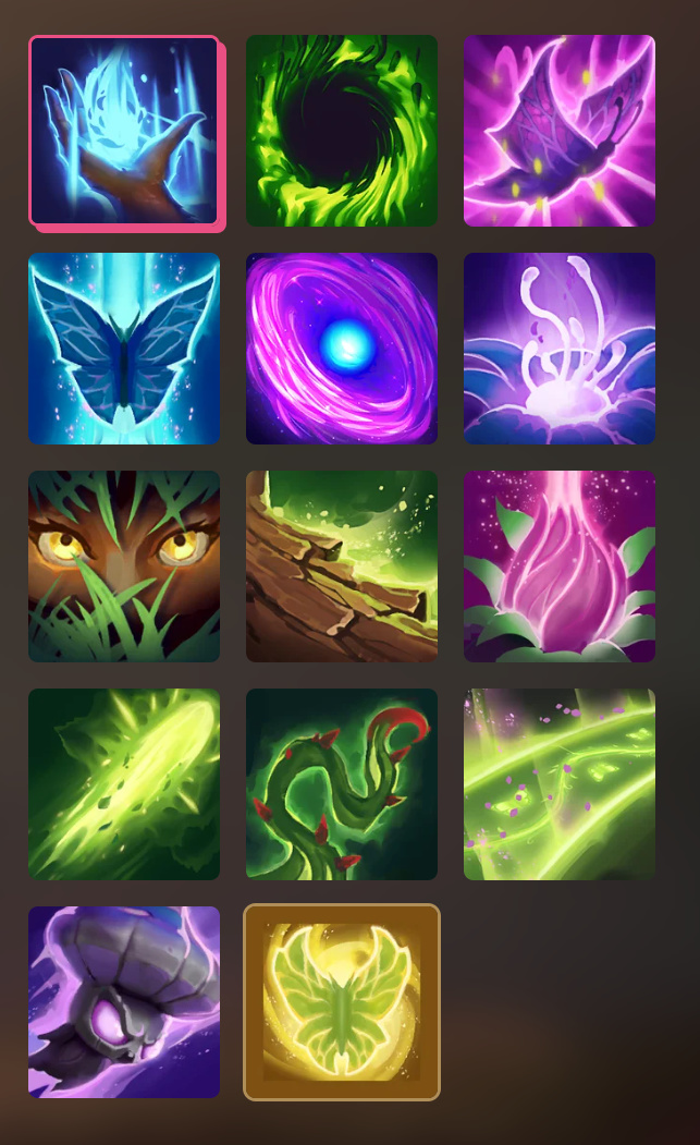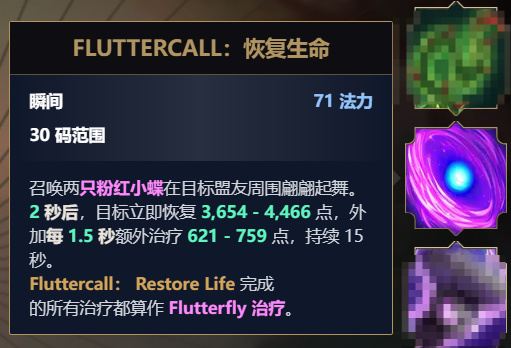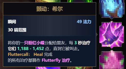 而粉蝴蝶被动主群奶,但是本身的回复量来说对于敌方爆发型输出的抵抗不算高,这个时候就有了另一个粉蝴蝶的派生技能。随机将两只粉蝴蝶从队友身上取消,然后开始在场地上游走并且围绕着对应目标的队友提供一个瞬时治疗,并且在接下来格外的15s内持续不断的治疗,而且这个时候还可以给失去蝴蝶的队友再套一层蝴蝶。