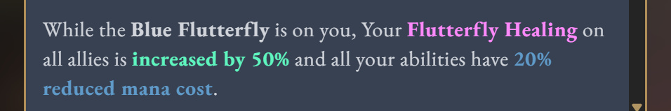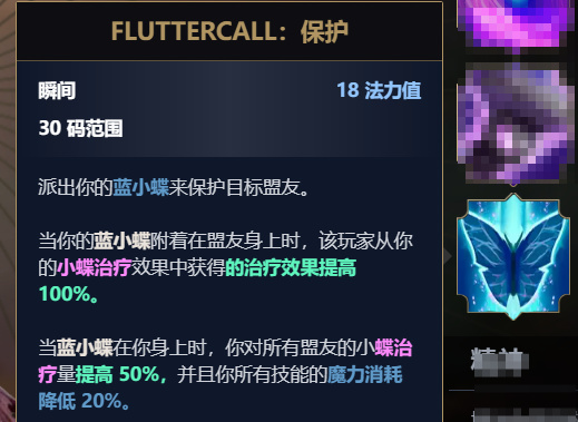但如果蓝蝴蝶是挂在我们自己身上就能够将所有队友身上的蝴蝶治疗增加50%,虽然治疗量增加少了但是由单体增加变成了全体增加,同时还会让所有技能的法力消耗降低20%,具体的大家就根据需要抬群奶还是单体拉血量来看了,常规BOSS前其实挂自身会更好一些