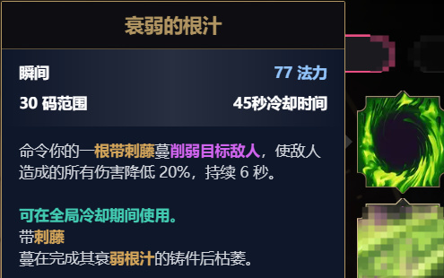 这一个技能并不是正面BUFF类型的,是能够让我们召唤出来的藤蔓对敌人造成一个削弱类型的DeBuff,让敌人造成的伤害降低20%并且持续6sw,可以说是一个不错的减益技能,,而且需要注意的是释放了技能的藤蔓会直接枯萎,能够有利于我们的战斗输出循环。