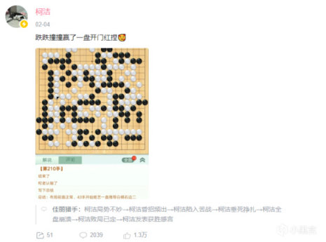 战鹰的棋就不用多聊,主要看柯洁。在开年第一局围甲补赛上,柯洁惊险战胜了柁嘉熹,取得开门红,这一局柯洁状态不佳,骑友调侃“柯洁局势不妙→柯洁昏招频出→柯洁陷入苦战→柯洁垂死挣扎→柯洁全盘崩溃→柯洁败局已定→柯洁发表获胜感言!”