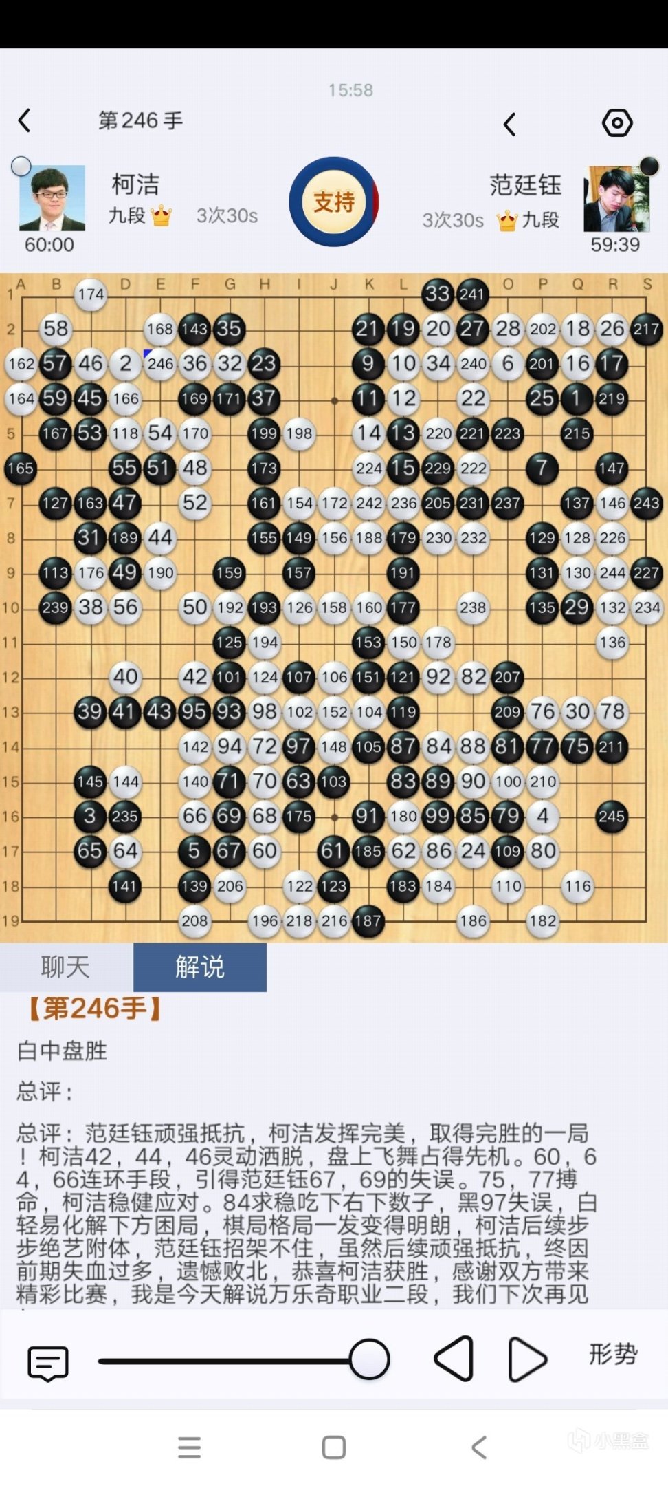 再看季后赛第二轮,深圳龙华队大战成都农商银行队,首回合双方不设立主将,状态复苏的柯洁再上快棋台,但没想到碰上了劲敌范廷钰九段!本场也是柯洁朝着季后赛进一步进军的关键局,本场比赛柯洁状态神勇,执白稳稳拿下范老板豪取三连胜!