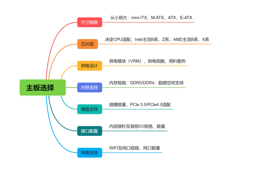 在价格之外,尺寸规格、芯片组、供电设计的重要性足够排在一级优先,其次是内存/硬盘/接口/网络的支持,对于颜值党来说,还要考虑颜色搭配。