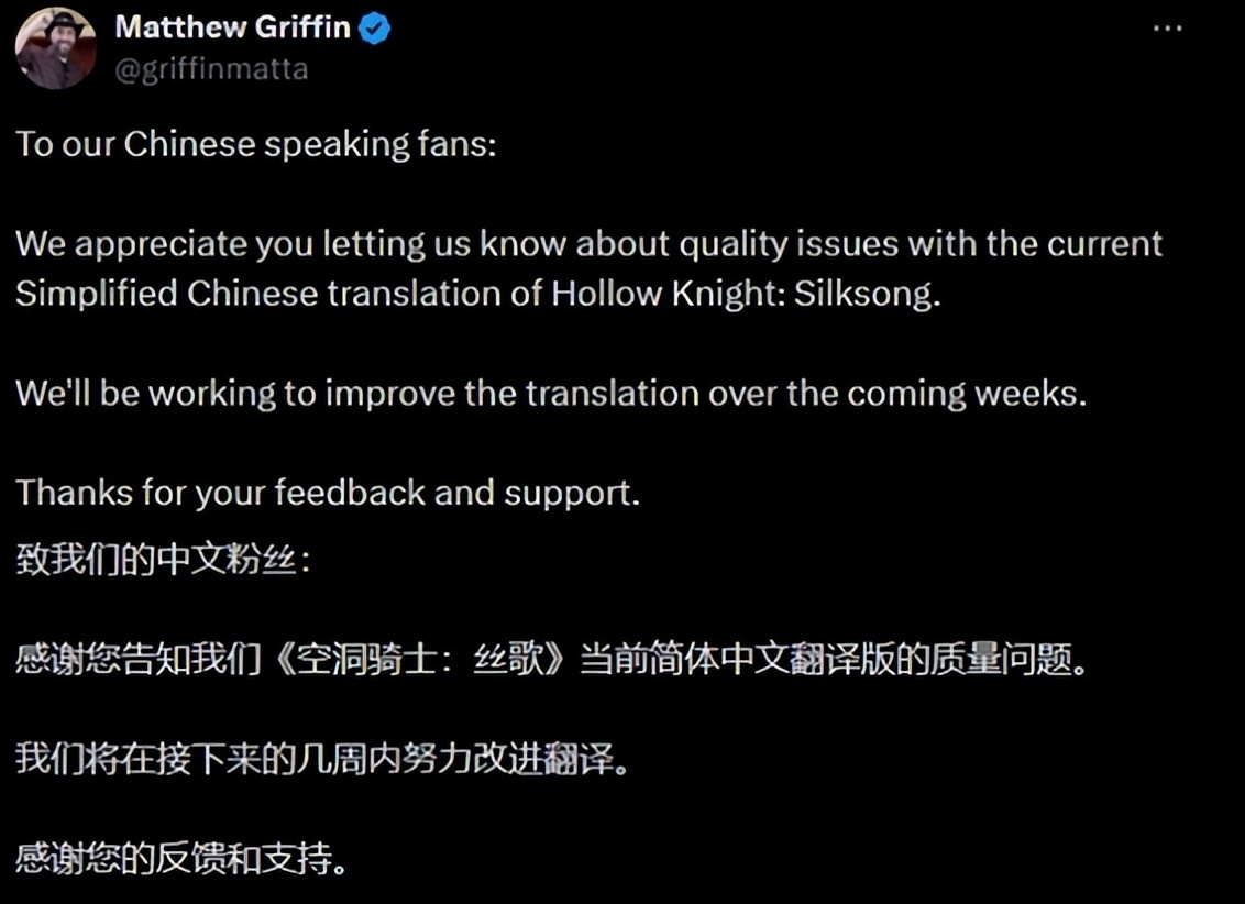 其實古風翻譯從來都不是問題,空洞騎士本來就帶着點這種古代或者說中世紀的語言風格,問題是這兩版翻譯都有各自的大問題,第一版翻譯不太瞭解文言文,只知道一些似是而非的文言知識,最後寫出來的東西跟文言文沒有一點關係;第二版翻譯他確實會文言文,也能寫點不至於像古風小生那樣低級的文言文,但是一點不瞭解翻譯的基本法,不知道哪裏該用文言文,不知道該用什麼樣的文言文,不知道哪裏該音譯,不知道哪裏該意譯,不知道哪裏該信哪裏該達哪裏該雅。相比之下第二版更完蛋了,而且第二版翻譯還一股AI改論文查重率的味,這個額外內容裏的灰魯特是中文嗎?不亞於日本人聽哈基米音樂聽到的是 “蜂蜜水蜂蜜水喝了蜂蜜水翻車魚跑快快”。