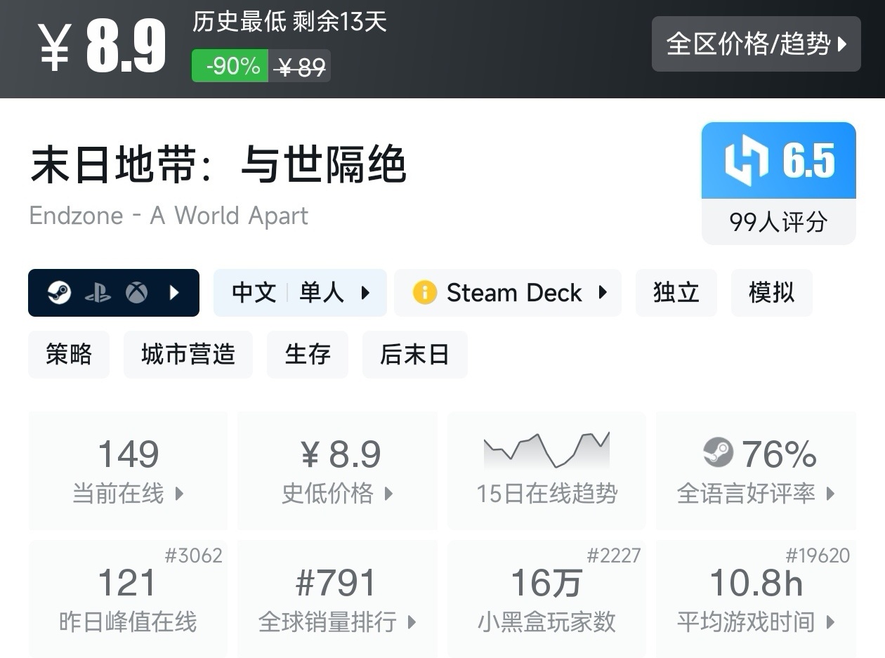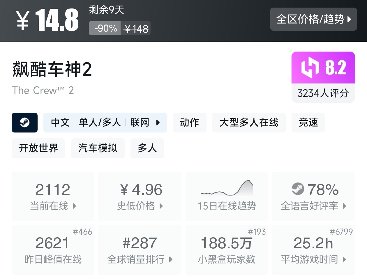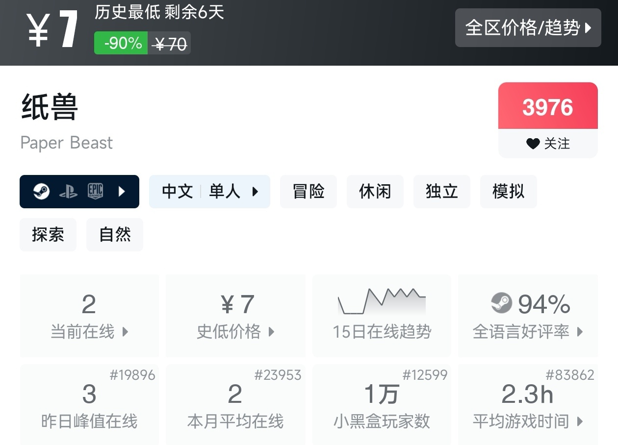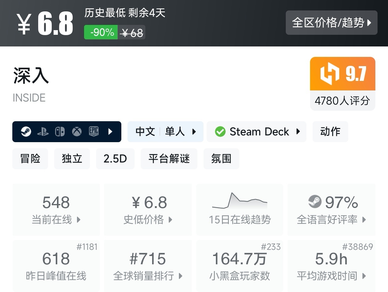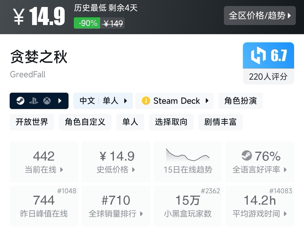 时隔几个月游戏才一折史低,很建议买,因为游戏体量很大。